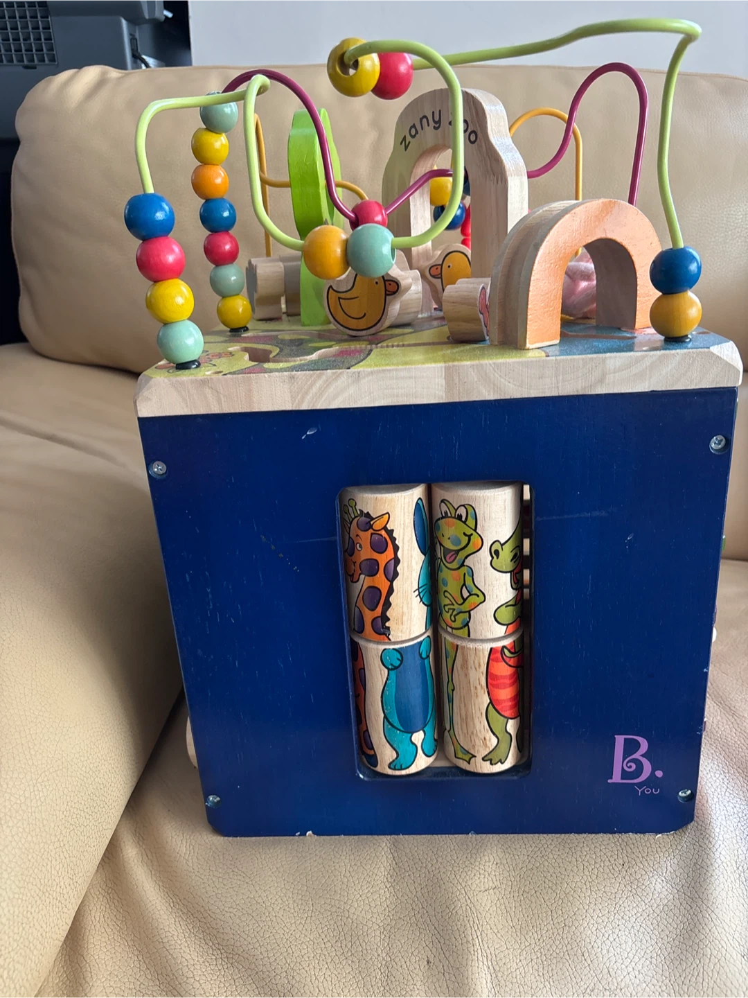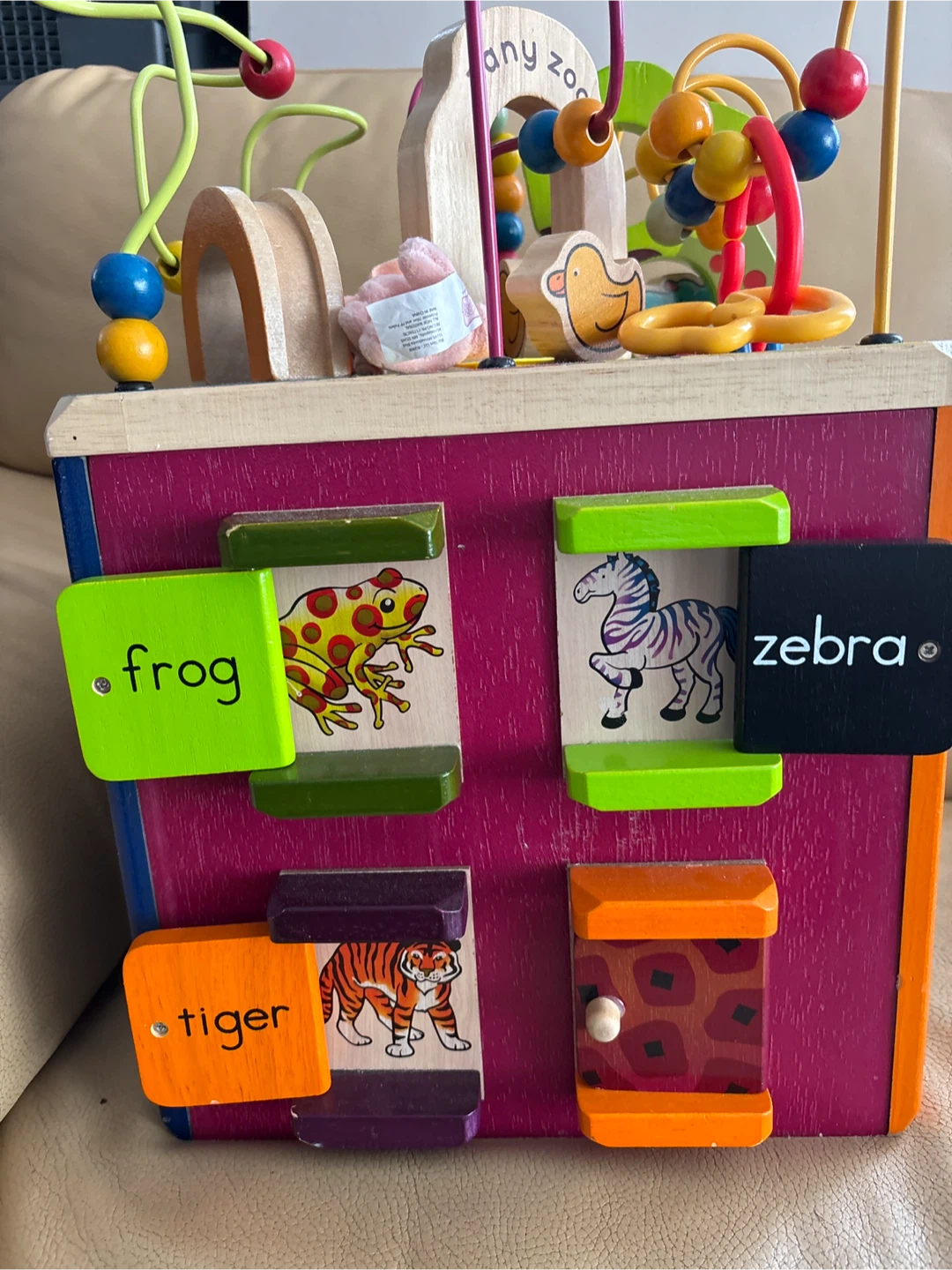 Looking to sell this B. toys Zany Zoo wooden activity cube. It's got lots of fun activities to keep your little one entertained! Features include a bead maze, animal matching, and more