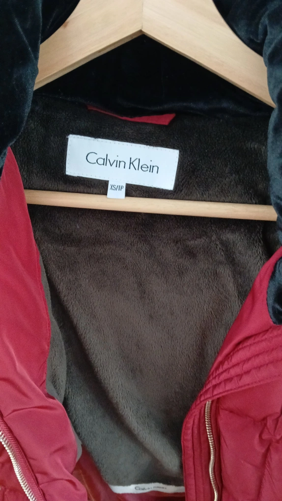 Selling a Calvin Klein red puffer jacket in size XS. It has a fur-trimmed hood and a cozy lining. Great for staying warm and stylish!