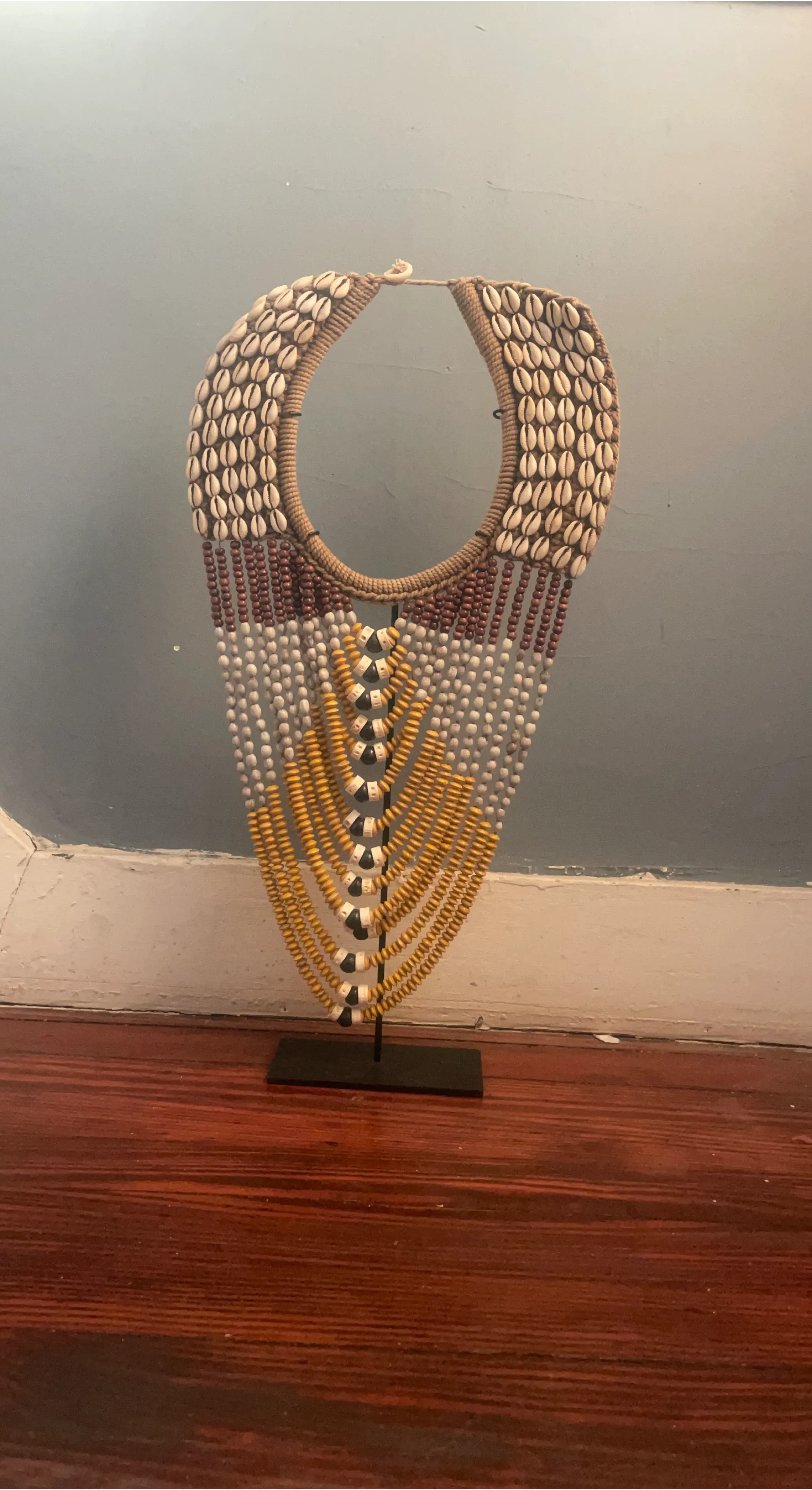 Unique decorative necklace featuring cowrie shells, brown wooden beads, white beads, and yellow beads. It's a statement piece that would look great in any room. Stand included!