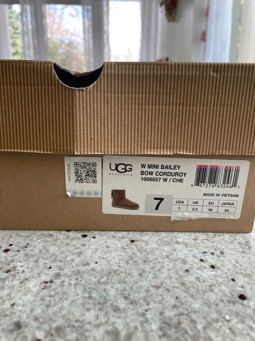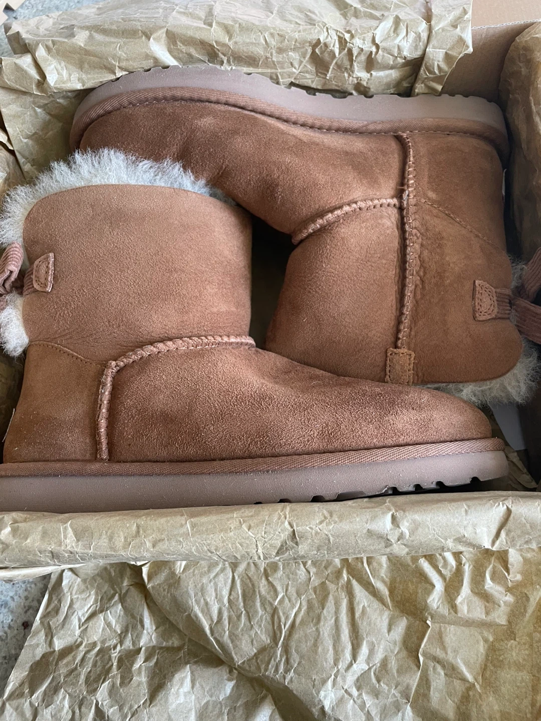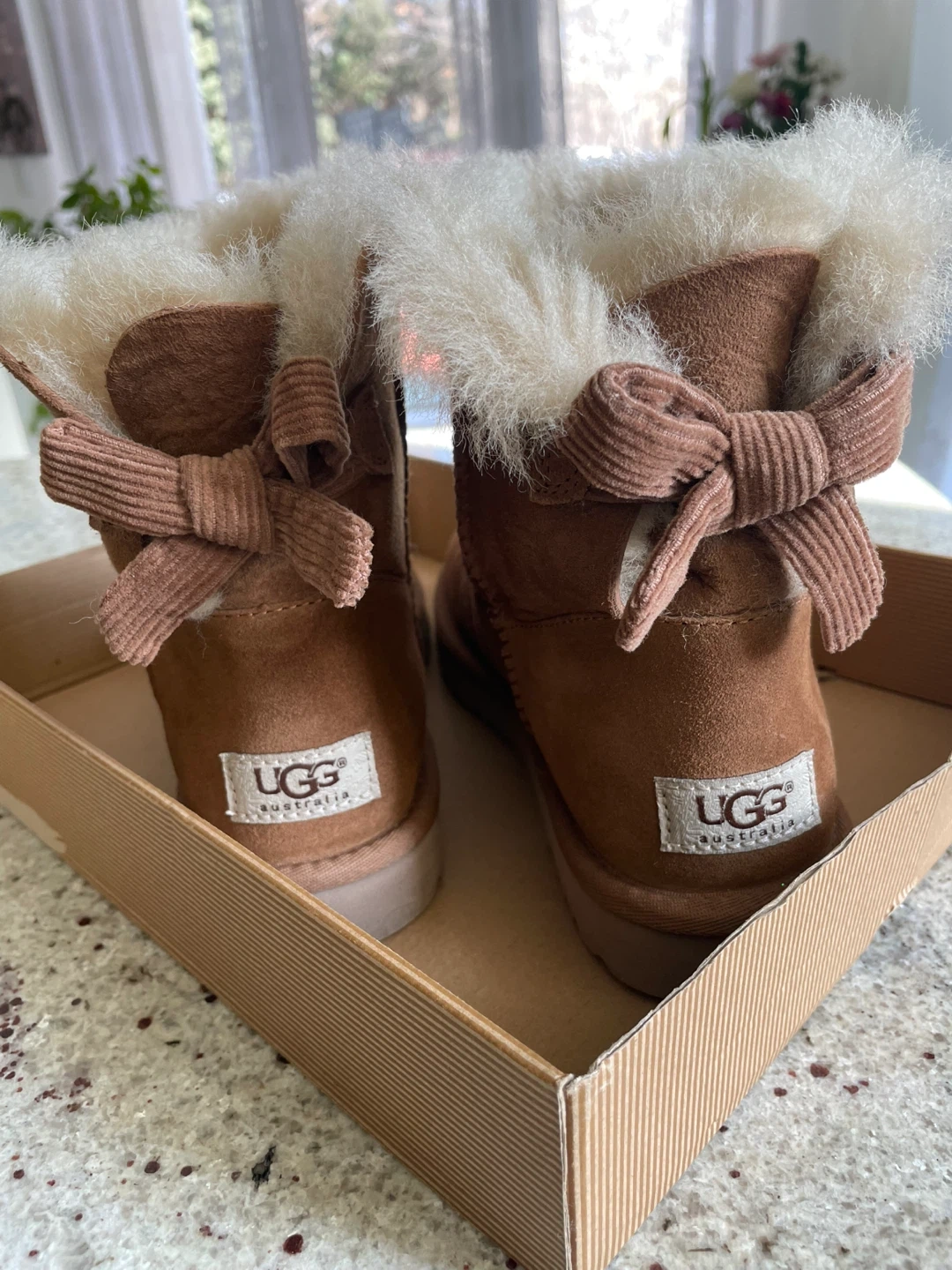 Selling a pair of UGG W Mini Bailey Bow Corduroy boots in size 7. Fits size 7.5 very comfortably as well. The corduroy bow is a special edition. These cute boots come with their original box! They are a stylish and cozy choice for the colder months. The shoe has been worn once, but size didn’t fit, hence selling. Price on Amazon for a similar one with satin bow is $204.99.