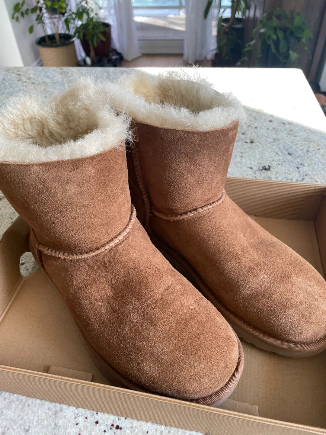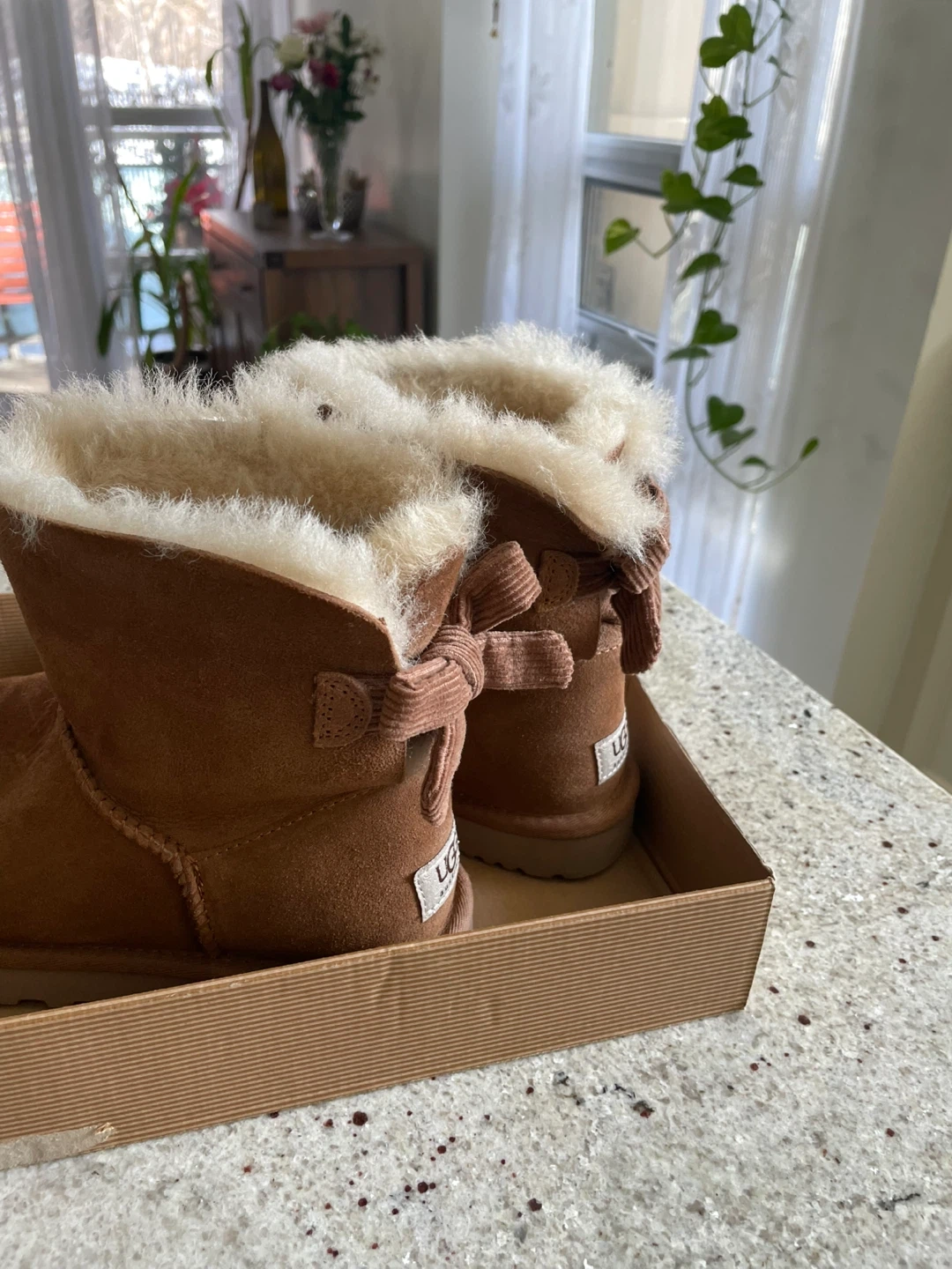 Selling a pair of UGG W Mini Bailey Bow Corduroy boots in size 7. Fits size 7.5 very comfortably as well. The corduroy bow is a special edition. These cute boots come with their original box! They are a stylish and cozy choice for the colder months. The shoe has been worn once, but size didn’t fit, hence selling. Price on Amazon for a similar one with satin bow is $204.99.