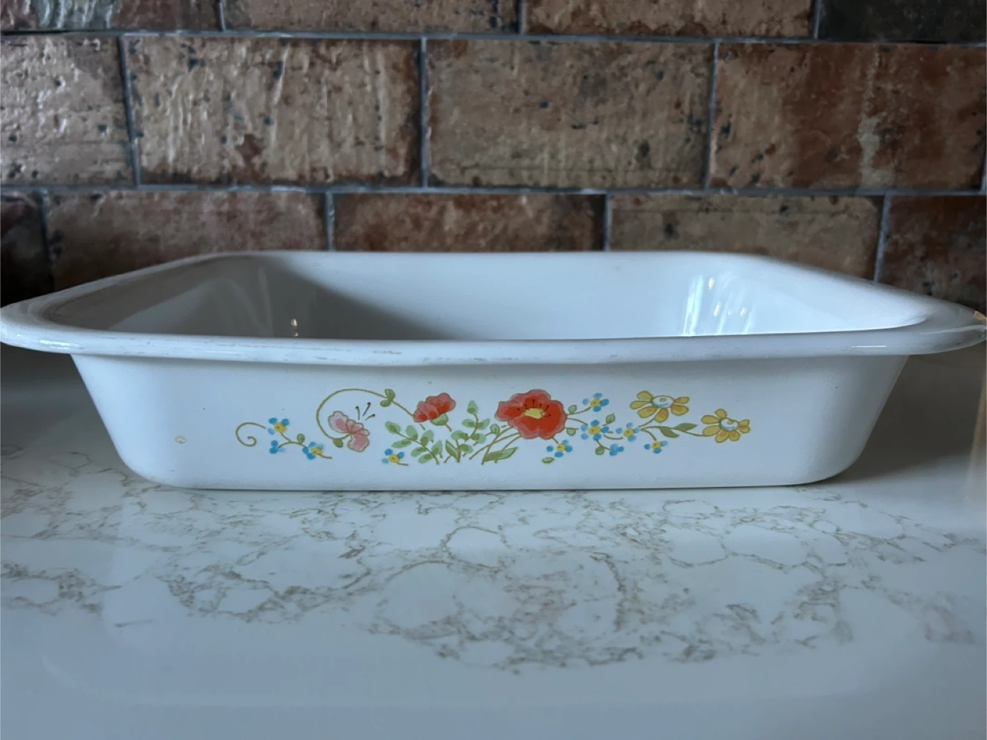 Selling a vintage Corelle baking dish! It features a charming floral design. This dish is perfect for baking and serving your favourite meals. It's in good condition and ready for a new home in your kitchen!