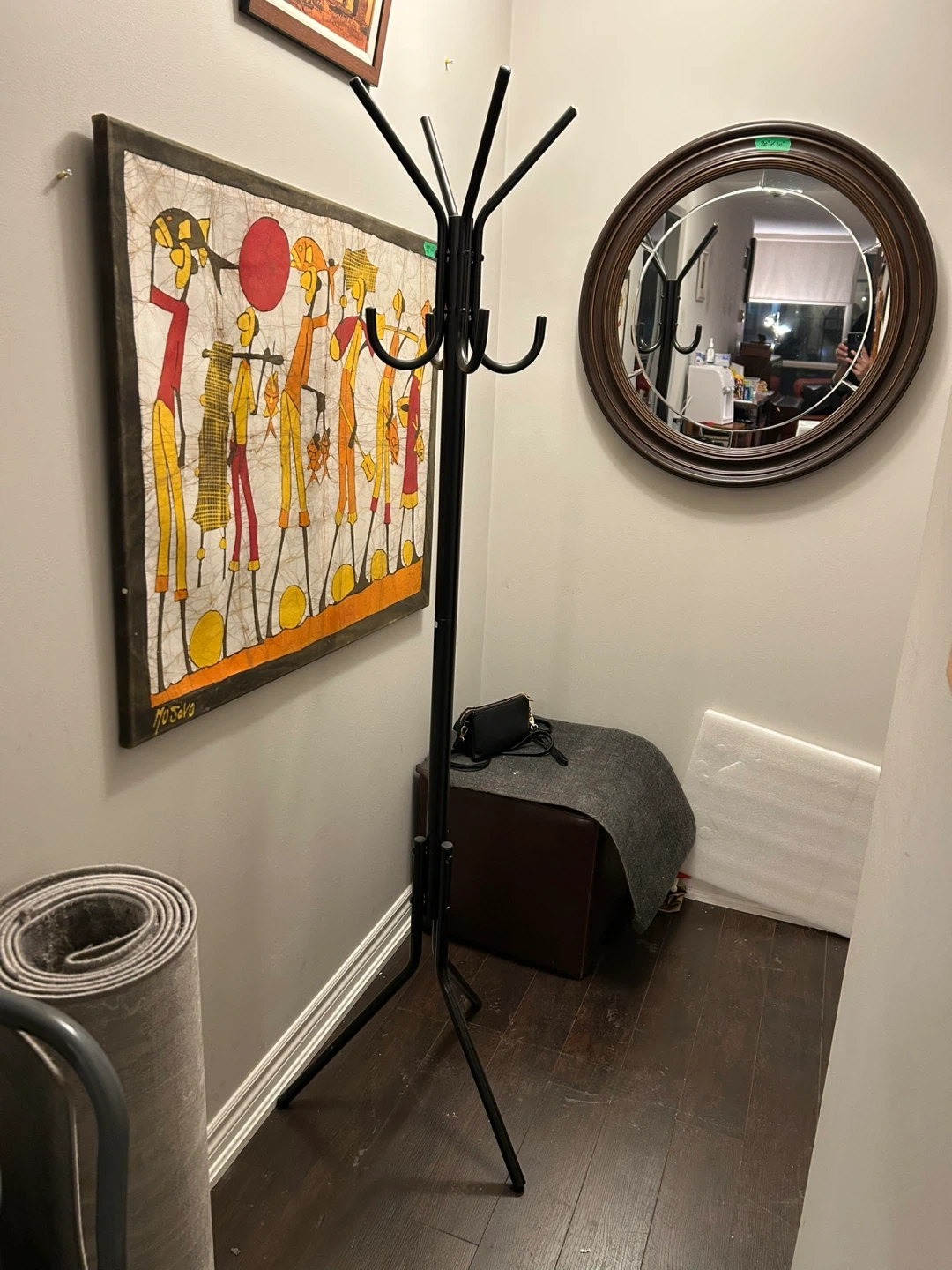 Selling a black metal coat rack stand. It's in great condition and ready to hold your coats, hats, and scarves! Perfect for keeping your entryway organized and tidy. Lightweight and comes apart into 2 pieces
