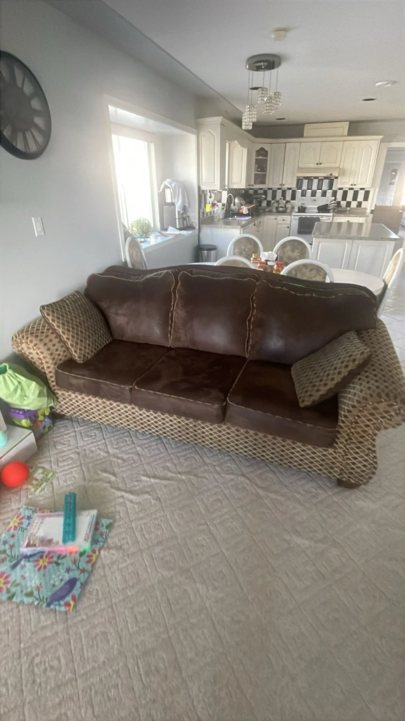 Selling a comfy brown 3-seater sofa. It's perfect for a living room or den. The sofa features patterned sides and comes with matching throw pillows. It has a classic design that would fit well in many homes