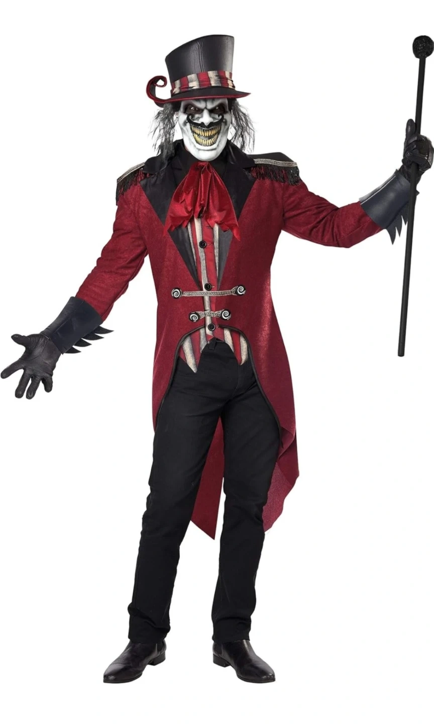 Get ready for Halloween with this Wicked Ringmaster costume by California Costumes! This adult-sized costume includes the jacket, vest, dickie with tie, top hat, and gloves. It's a size large (42-46). Make a statement at your next costume party!