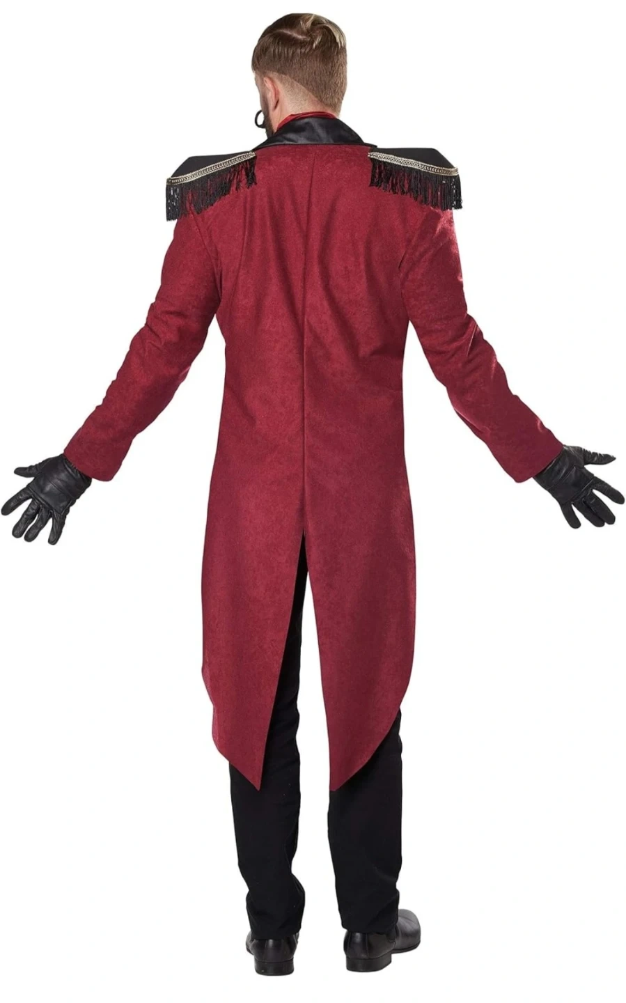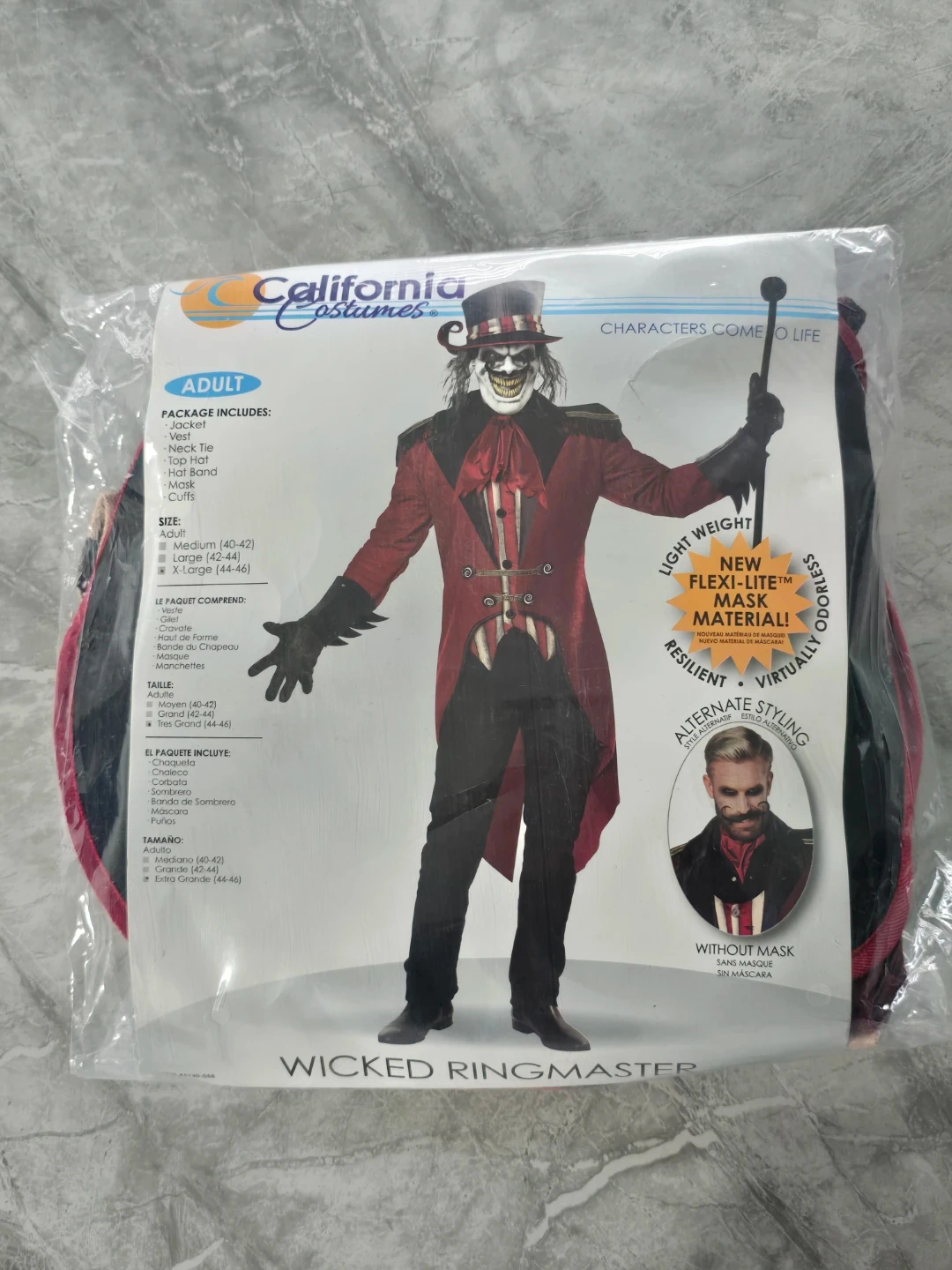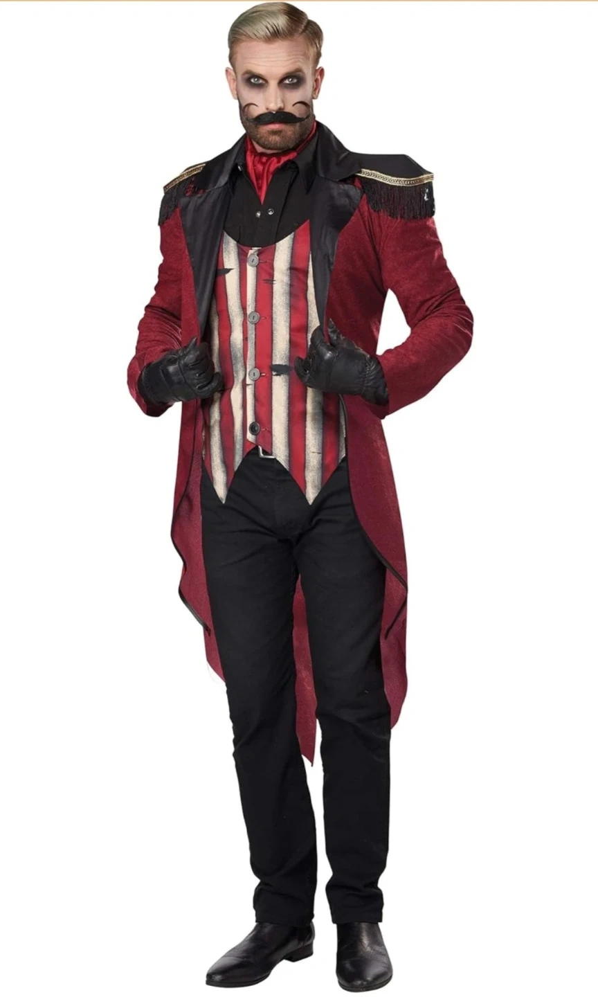 Get ready for Halloween with this Wicked Ringmaster costume by California Costumes! This adult-sized costume includes the jacket, vest, dickie with tie, top hat, and gloves. It's a size large (42-46). Make a statement at your next costume party!