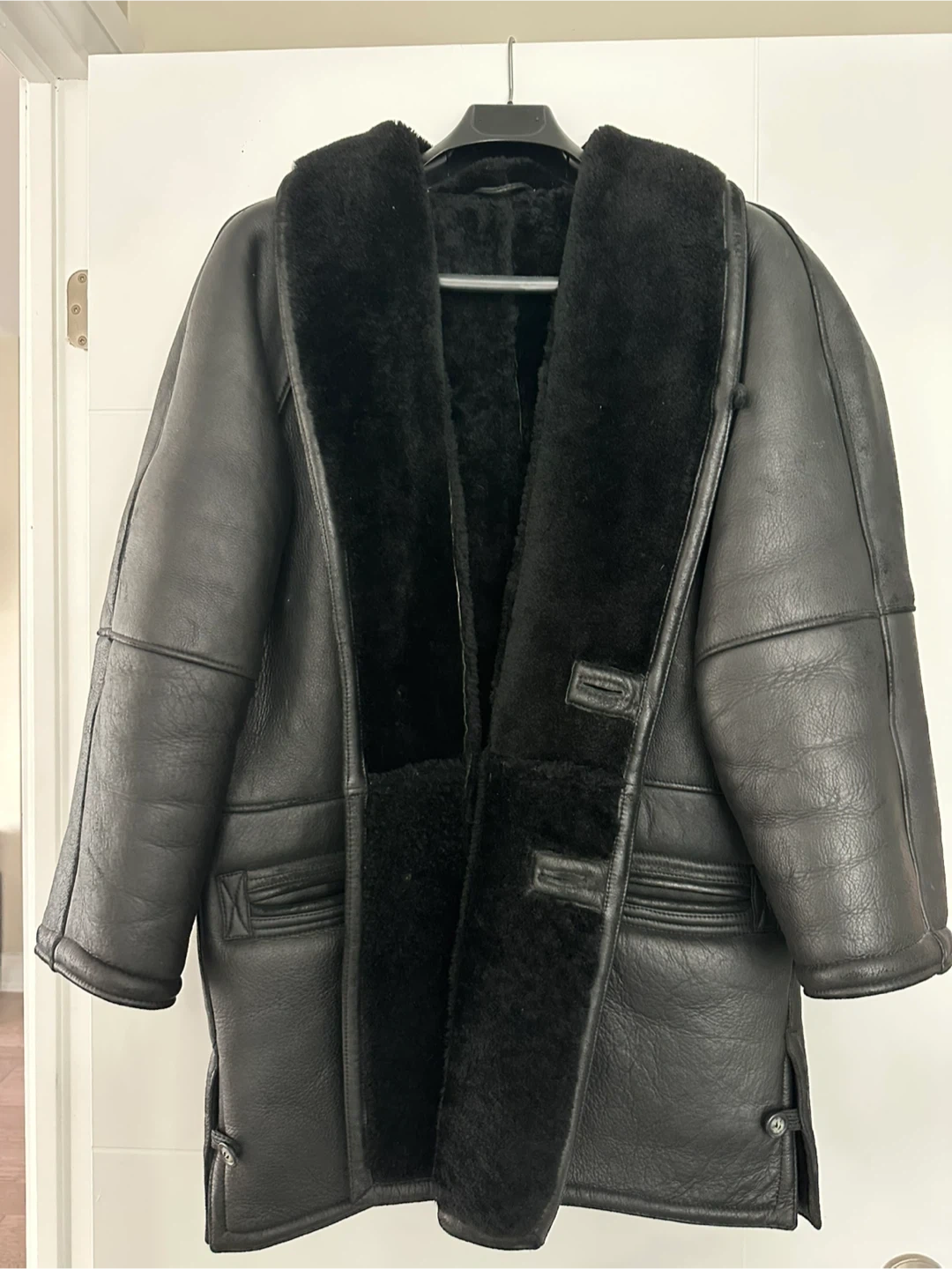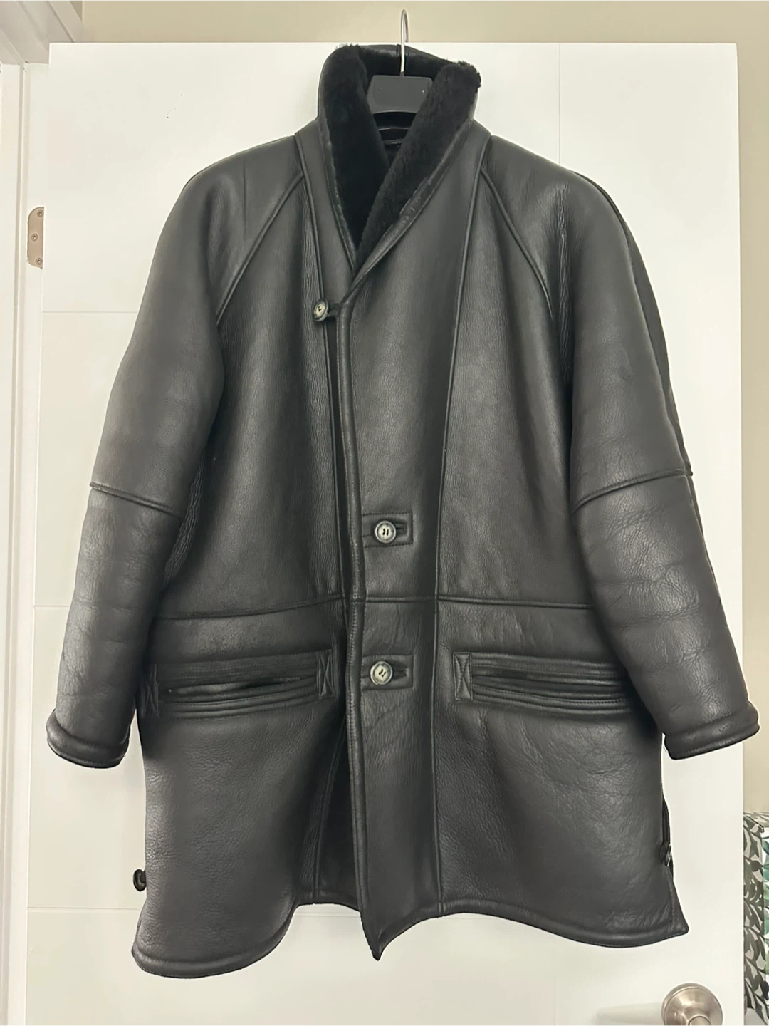 Cozy up in this Shearling black sheep leather coat! It's a size 50 and ready to keep you warm during those chilly Canadian days. The coat is in great condition and has a classic look that will never go out of style. Made in Tuscany, Italy.