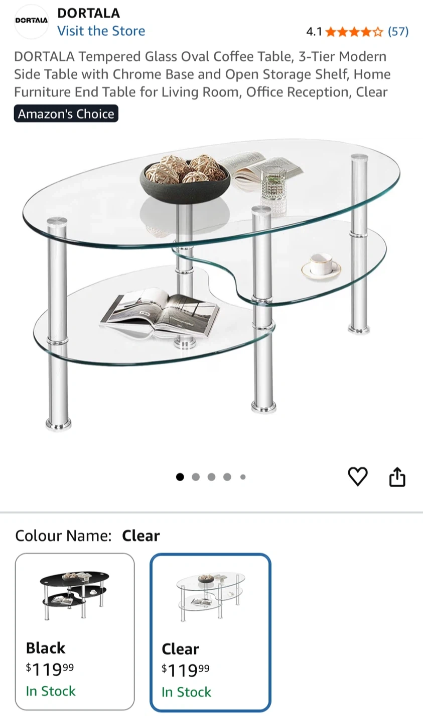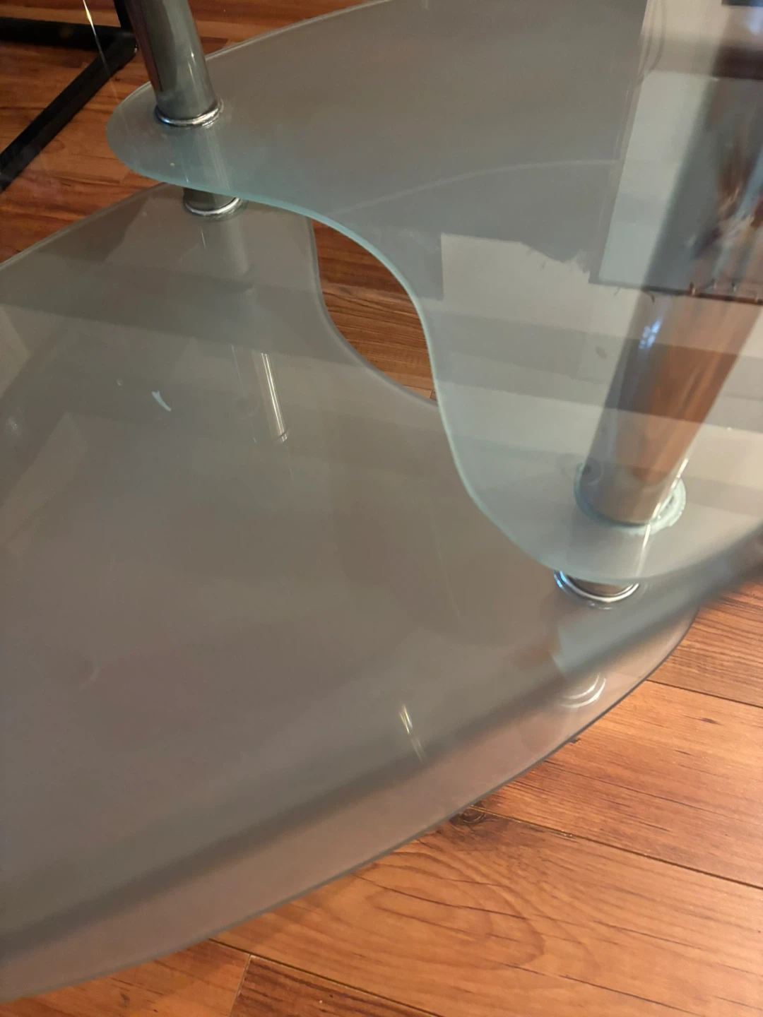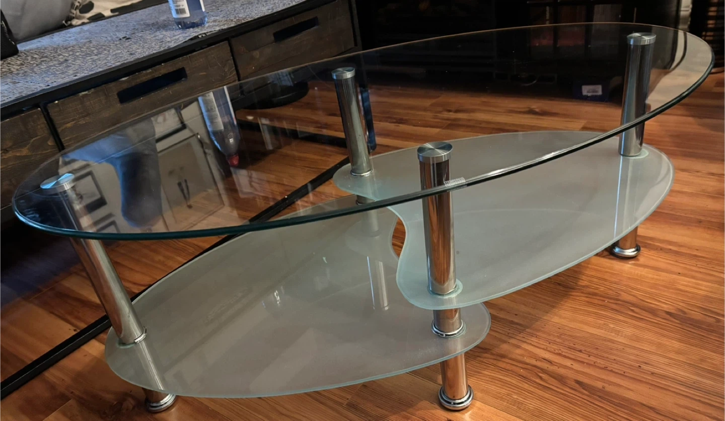 Selling this three-tier oval coffee table made of tempered clear and frosted glass with chrome-plated stainless steel legs. It’s in good condition with minor wear and tear.