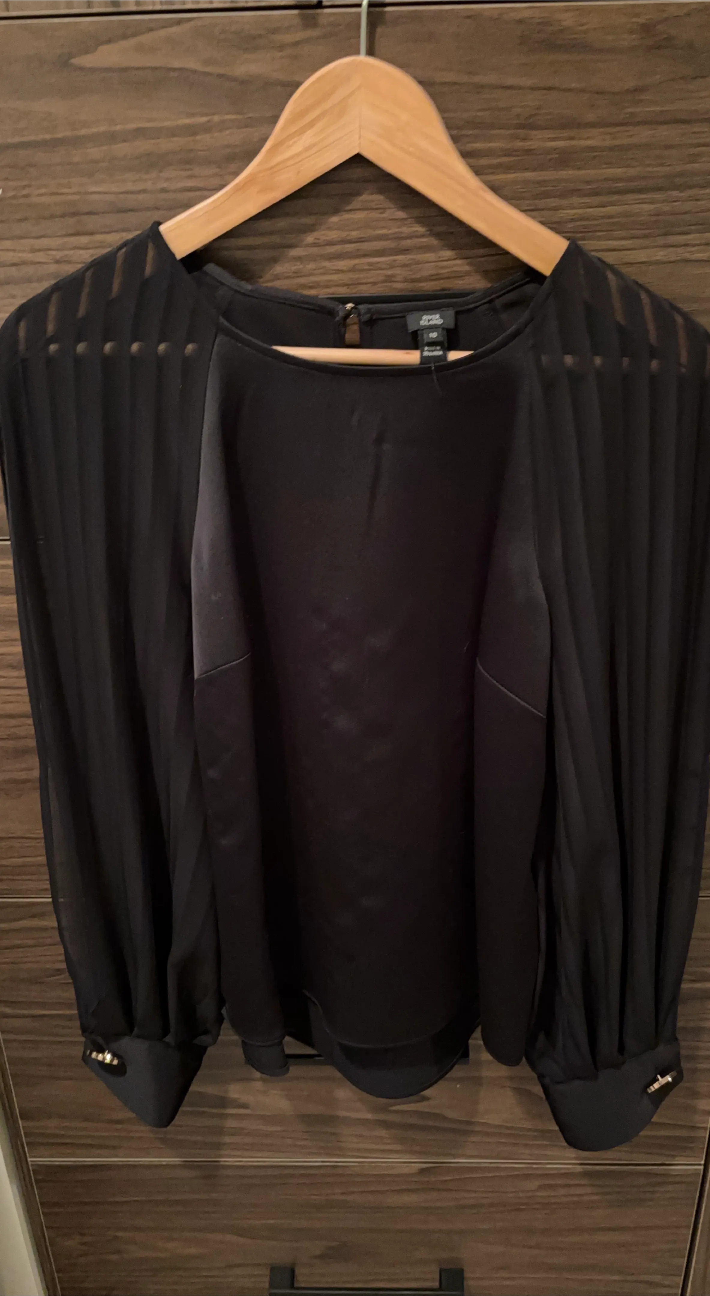 River Island black blouse in size 10! The blouse features a round neck and long sleeves with pleated detailing on the shoulders and sleeves. Perfect for a night out or a special occasion!