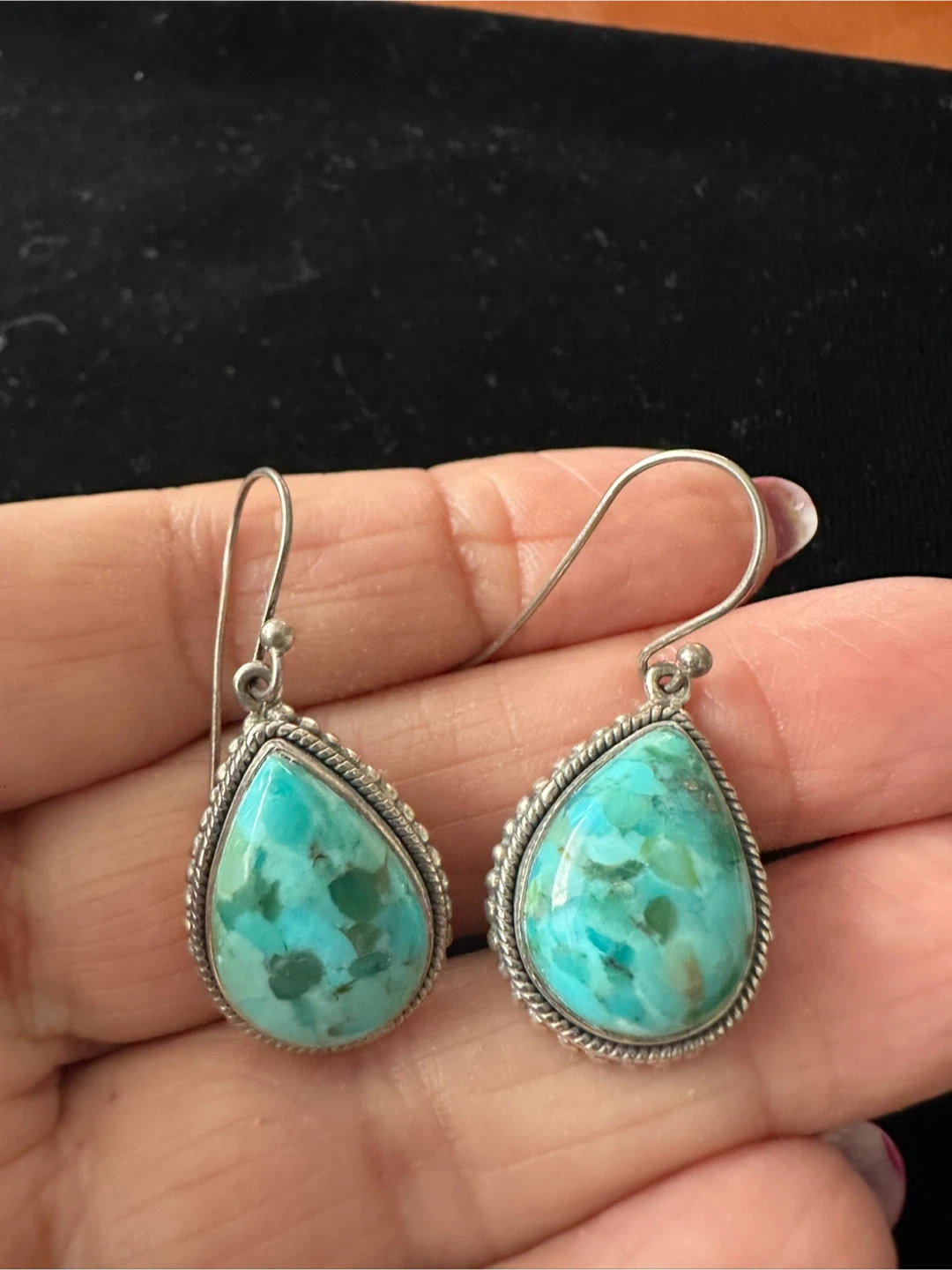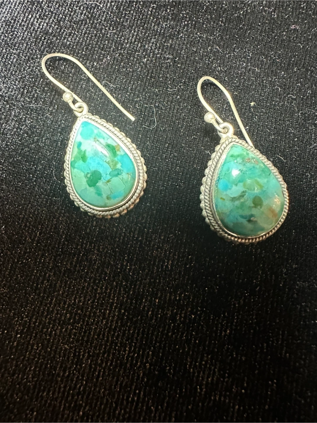 Selling a pair of beautiful teardrop dangle earrings. They feature a lovely turquoise stone with sterling silver detailing. These earrings would make a great addition to any jewelry collection!