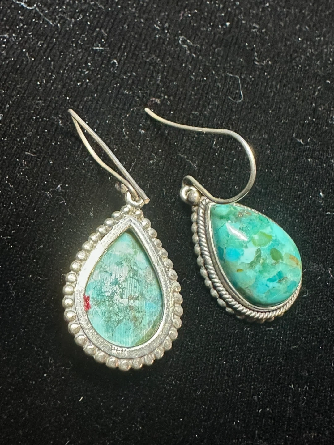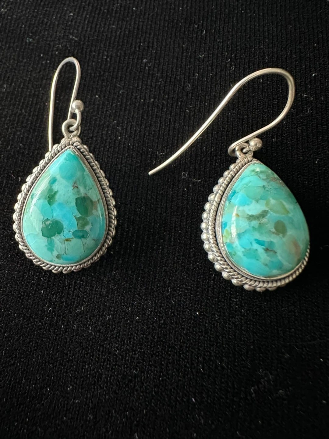 Selling a pair of beautiful teardrop dangle earrings. They feature a lovely turquoise stone with sterling silver detailing. These earrings would make a great addition to any jewelry collection!