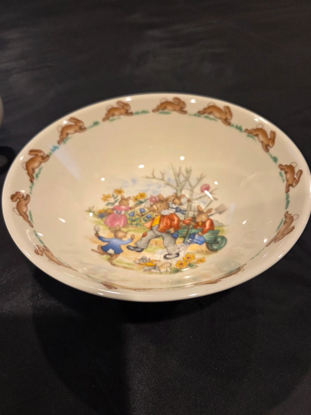 Here's a charming vintage Bunnykins bowl by Royal Doulton! It features a delightful scene with bunnies and a cute bunny border. Perfect for adding a touch of whimsy to your kitchen or collection