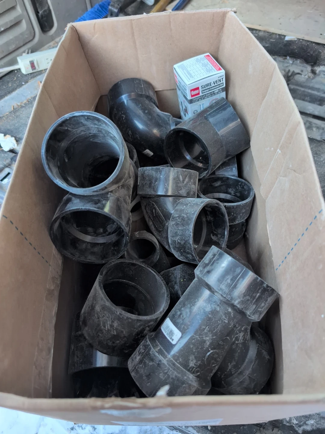 Selling a collection of black ABS fittings and an Oatey Sure-Vent air admittance valve. These are perfect for plumbing projects. The Sure-Vent is suitable for 1-1/2" or 2" ABS pipes (40 mm or 50 mm). Great for any DIY enthusiast or professional plumber.