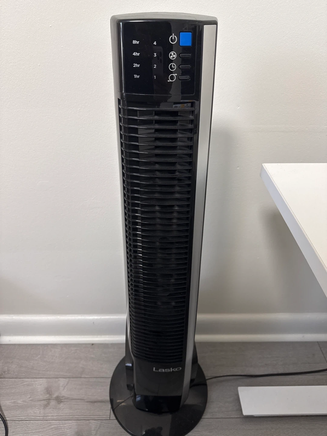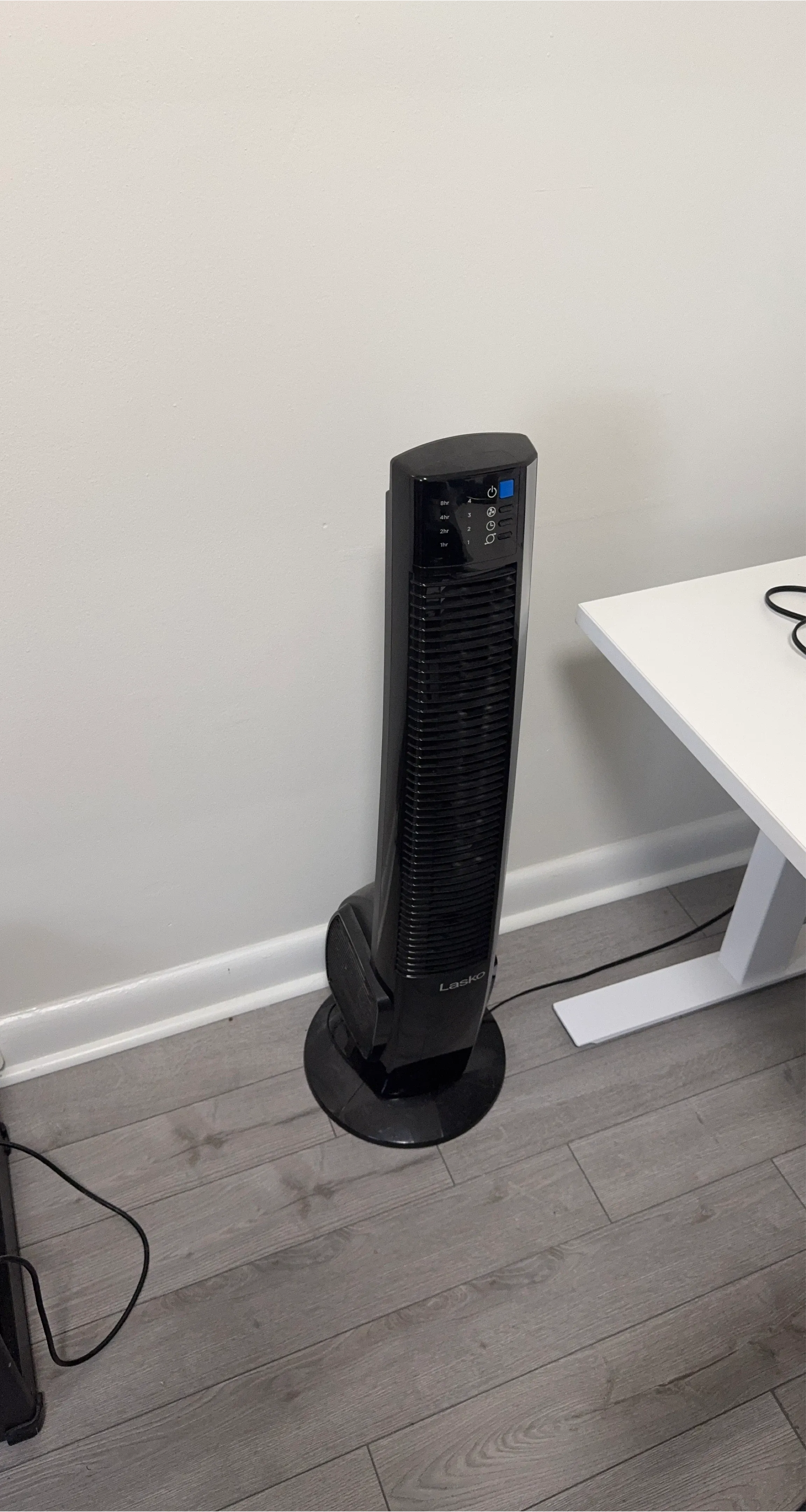 Selling a black Lasko tower fan. It's in great shape and ready to keep you cool! It features multiple timer settings and speed settings to customize your comfort.