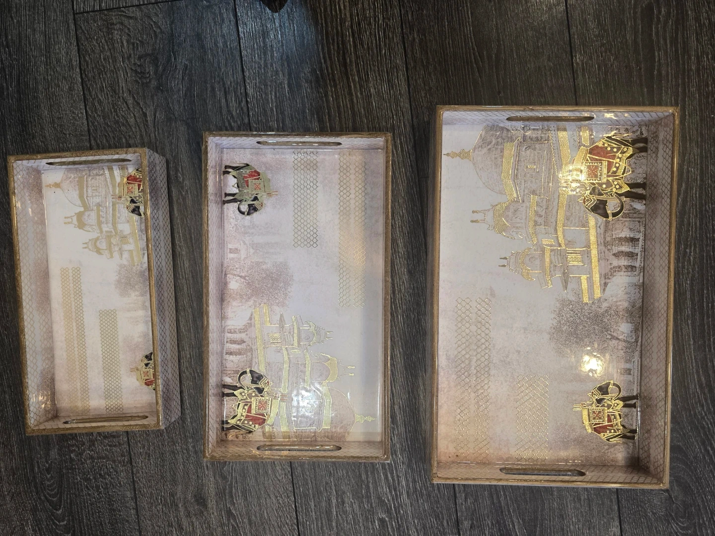 Here's a set of three decorative serving trays! They feature a unique design with elephants and buildings in gold. Perfect for adding a touch of elegance to your home or for serving guests