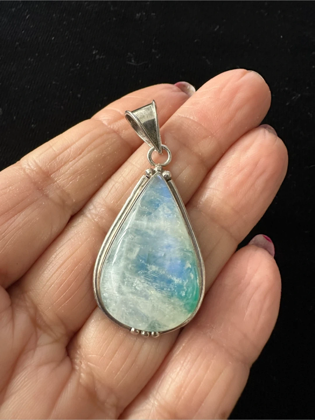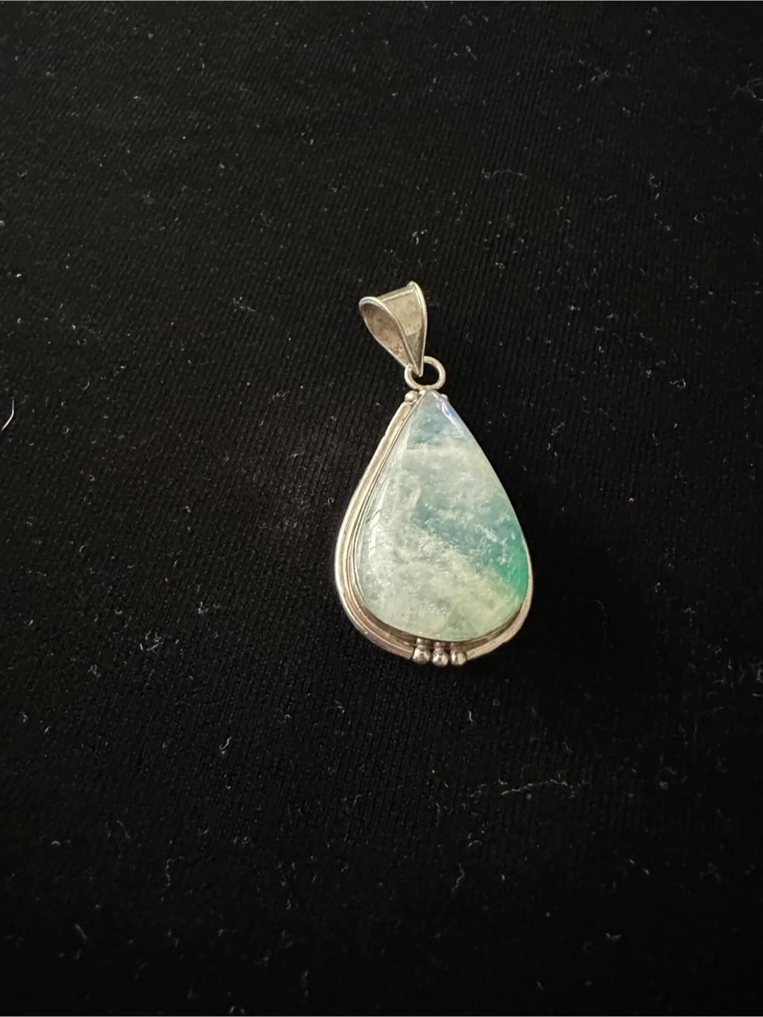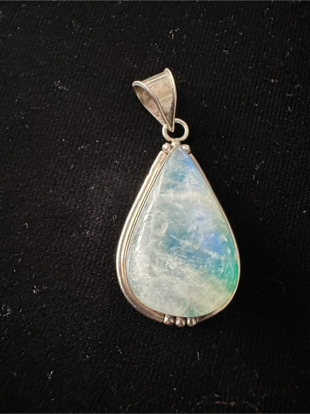 Selling a beautiful teardrop-shaped moonstone pendant! The stone has lovely blue and green hues. It's set on sterling silver. A lovely piece to add to your collection