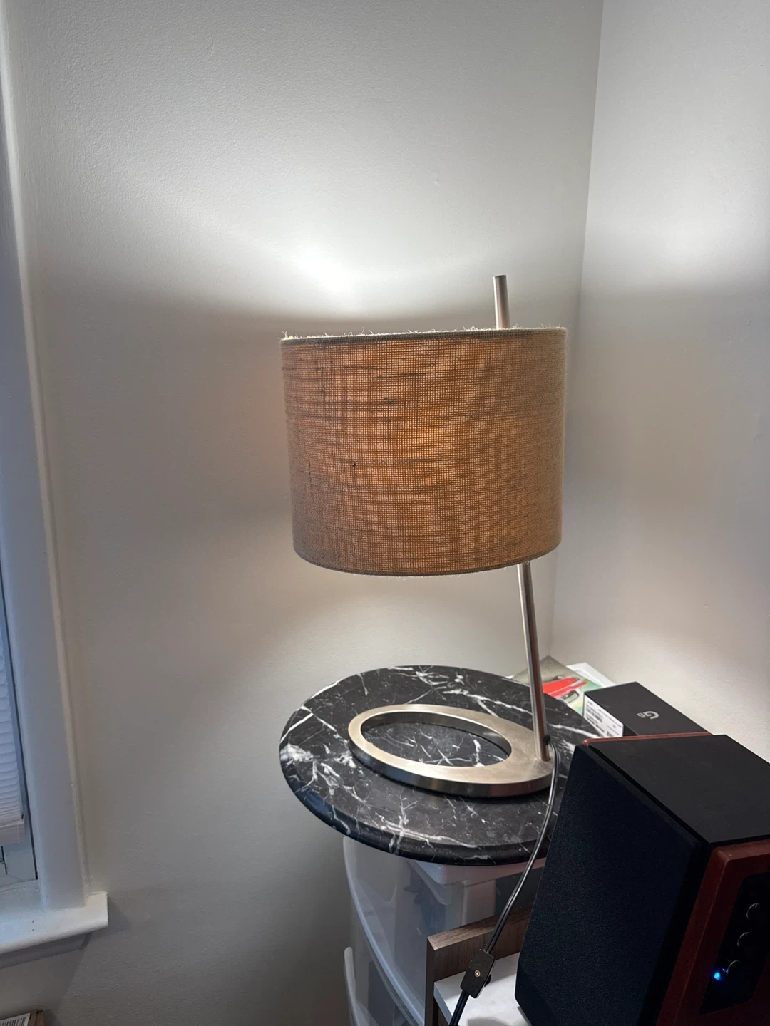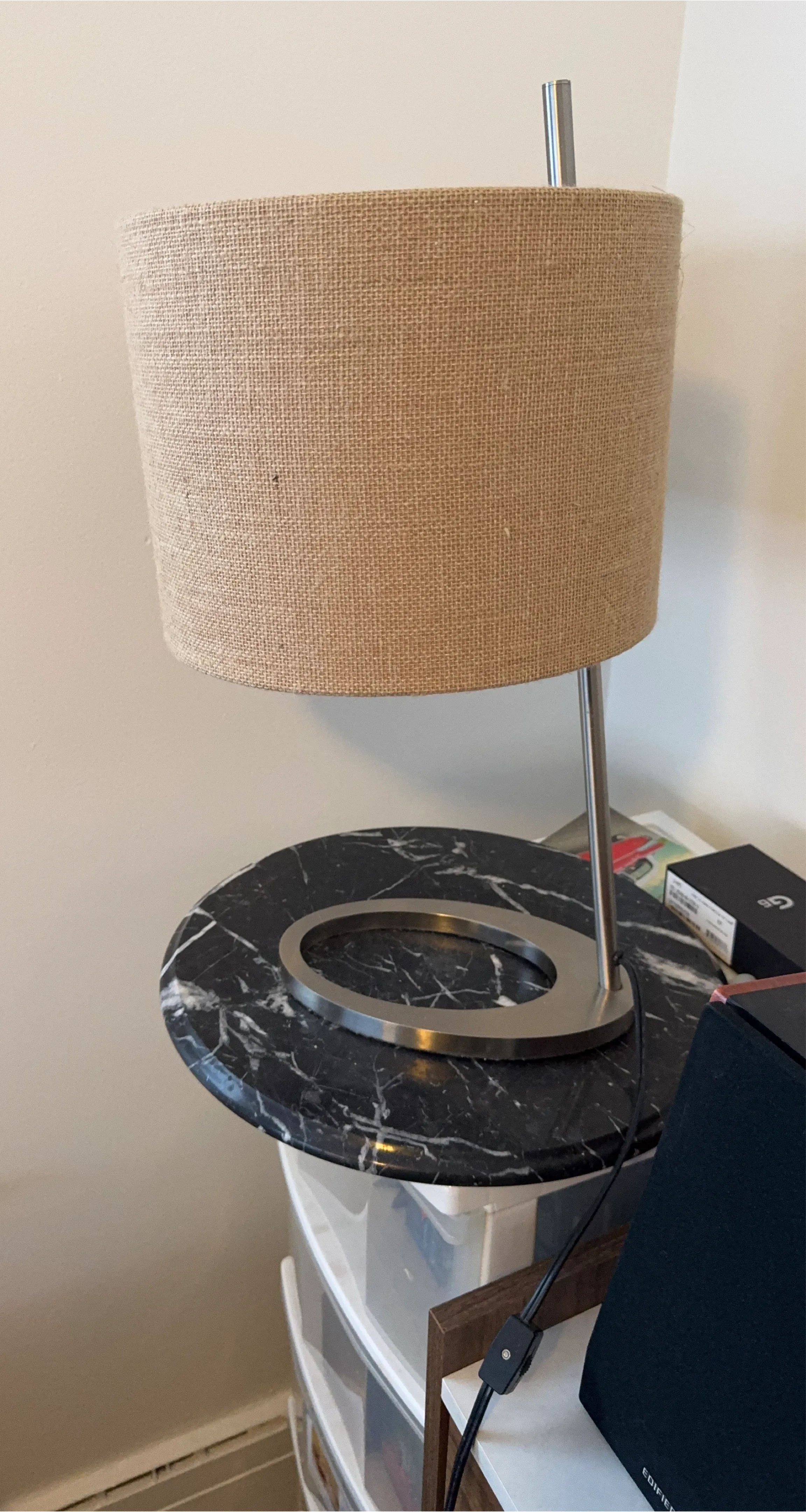 Selling a stylish table lamp featuring a burlap shade and a sleek, modern design. It's perfect for adding a warm and inviting glow to any room. The lamp has a sturdy base and is in great condition. It would look great on a side table or desk!