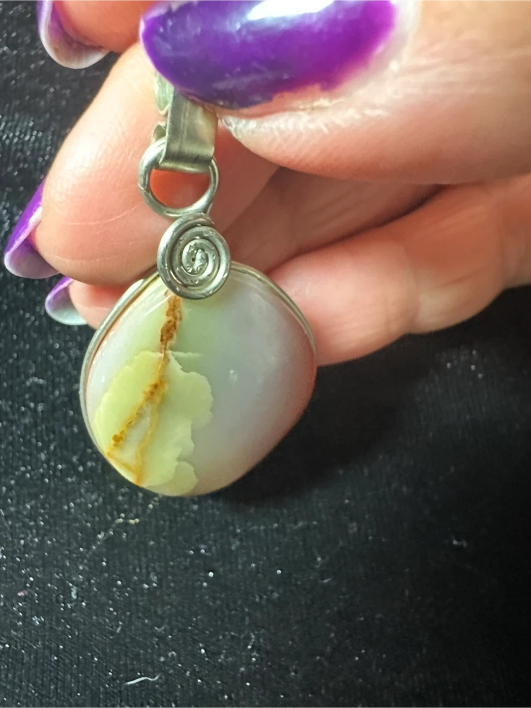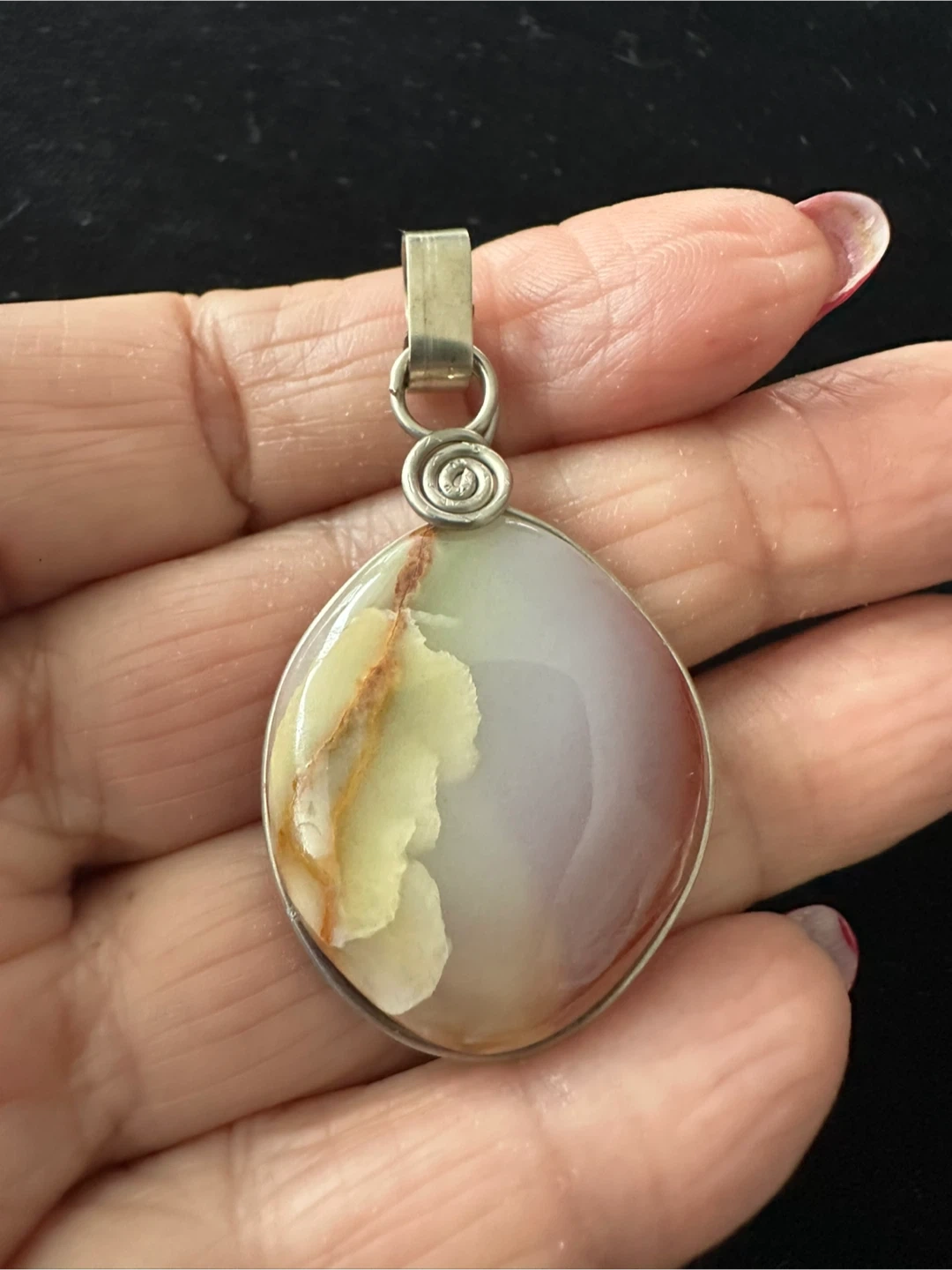 Selling a vintage pendant featuring a unique agate stone with a sterling silver bail. The stone has a lovely mix of colours. A beautiful addition to any jewellery collection!