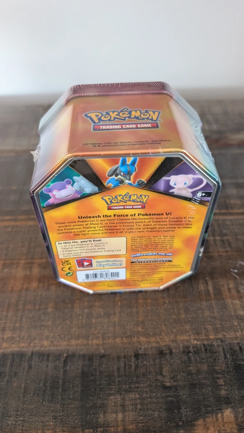 Selling a Pokémon Trading Card Game V Forces Tin featuring Mew V! This tin includes: