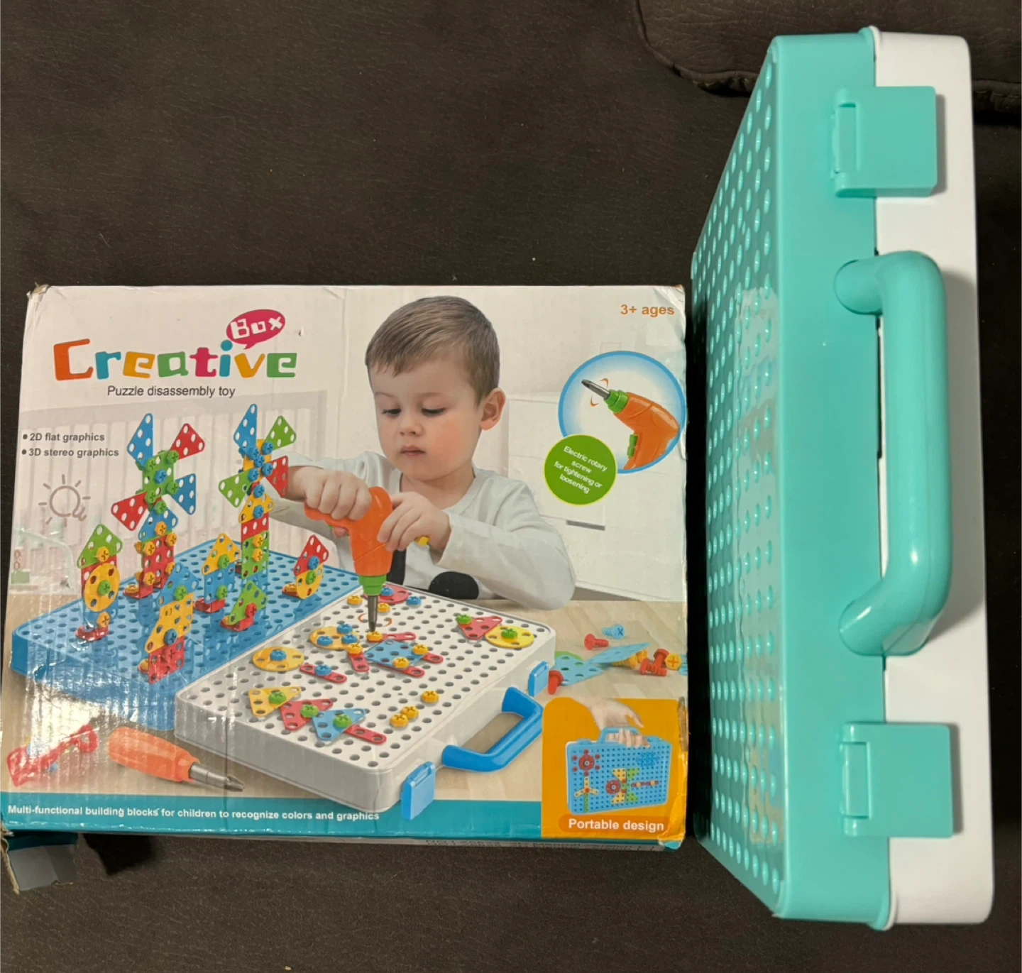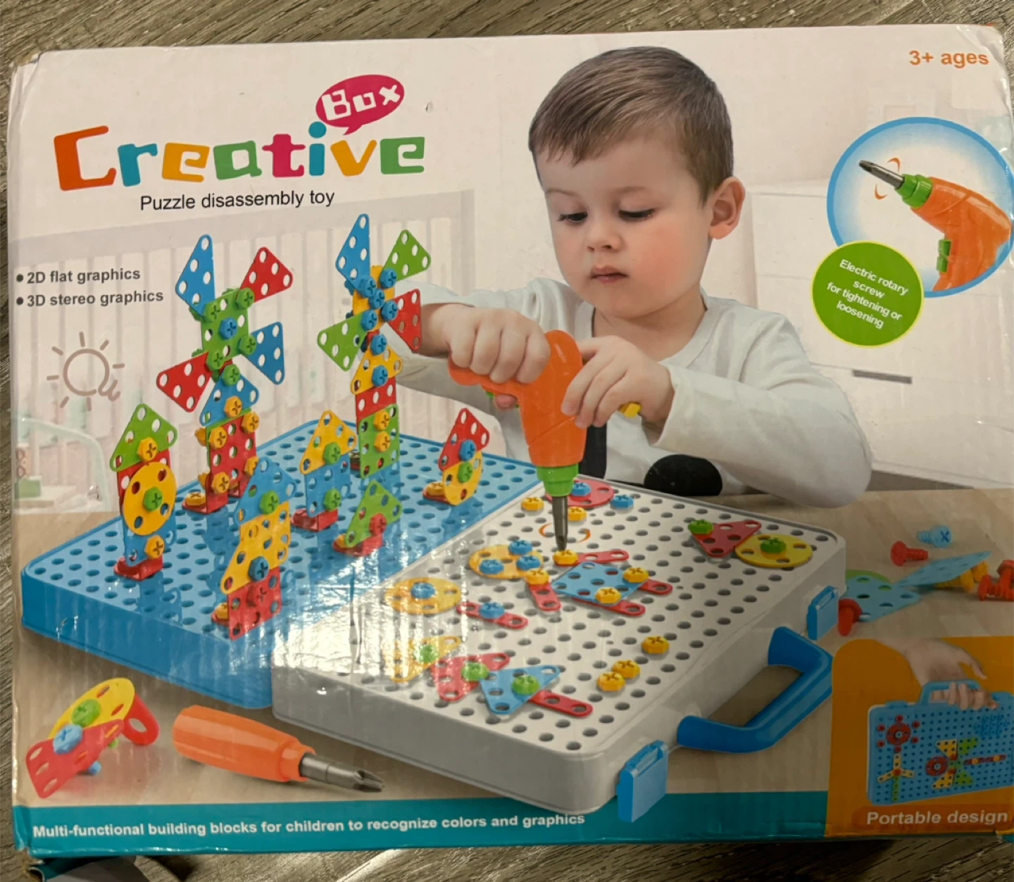 Creative Box puzzle disassembly toy for children 3+ years of age. This set comes with a portable design case and includes 2D flat graphics and 3D stereo graphics pieces. It also features an electric rotary screw for tightening or loosening the pieces. Multi-functional building blocks help children recognize colours and graphics