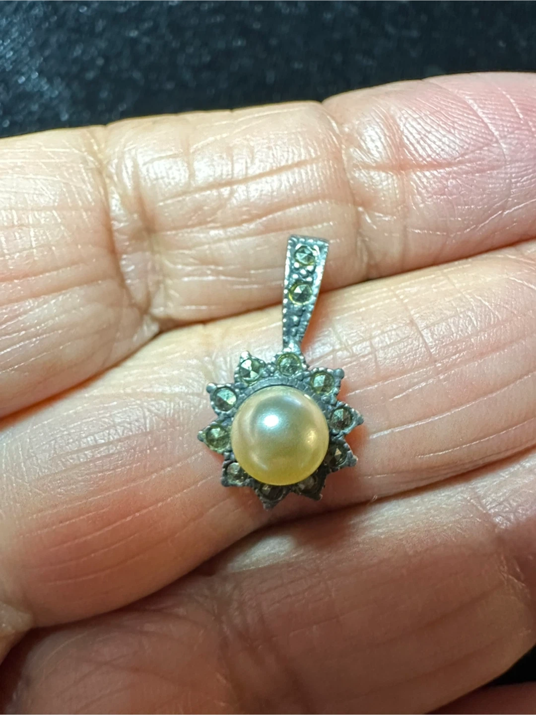 Beautiful pearl and marcasite pendant in excellent condition! This pendant features a luminous pearl centre surrounded by sparkling marcasite stones. Perfect for adding a touch of vintage charm to any outfit