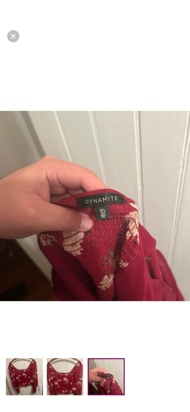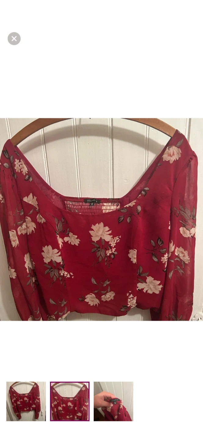 Dynamite brand. Long sleeve cropped sheer blouse. Red with white floral print. Size large. Brand new condition