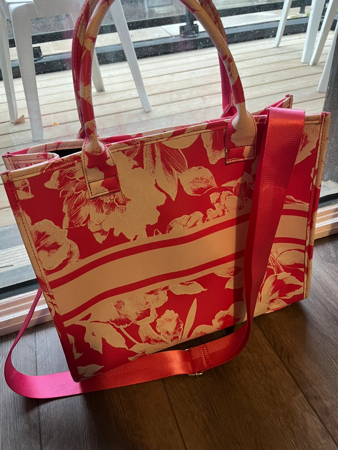 Selling a tote bag with a vibrant floral pattern in shades of red and cream. It features sturdy handles and a detachable shoulder strap for versatile carrying options. Perfect for everyday use!