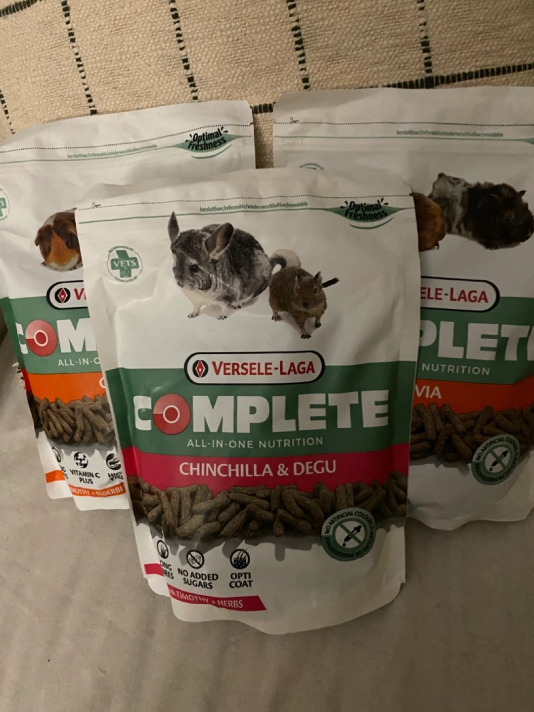 Selling a bag of Versele-Laga Complete food for chinchillas and degus. It's an all-in-one nutrition pellet food with timothy and herbs. It contains no added sugars and is designed for optimal freshness