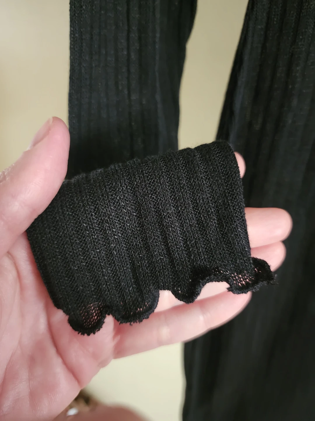 Offering a lovely black, long-sleeve dress with lettuce trim finish.