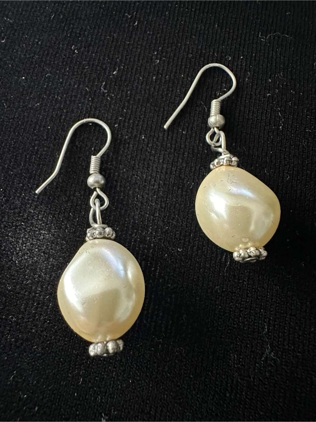 Selling a pair of elegant pearl drop earrings. They have a classic and timeless design. The pearls are a beautiful creamy colour, complemented by sterling silver accents. These are perfect for adding a touch of sophistication to any outfit!