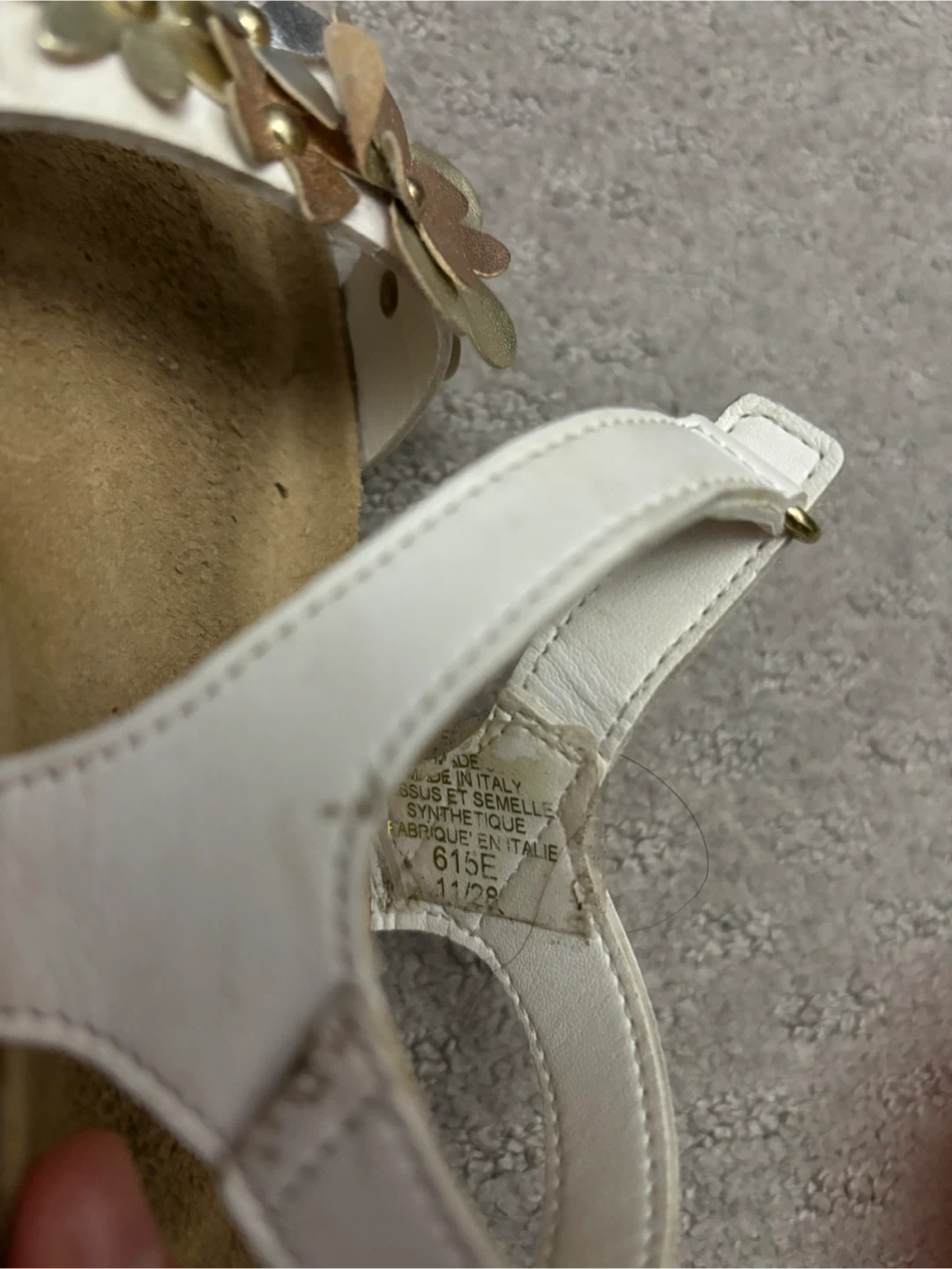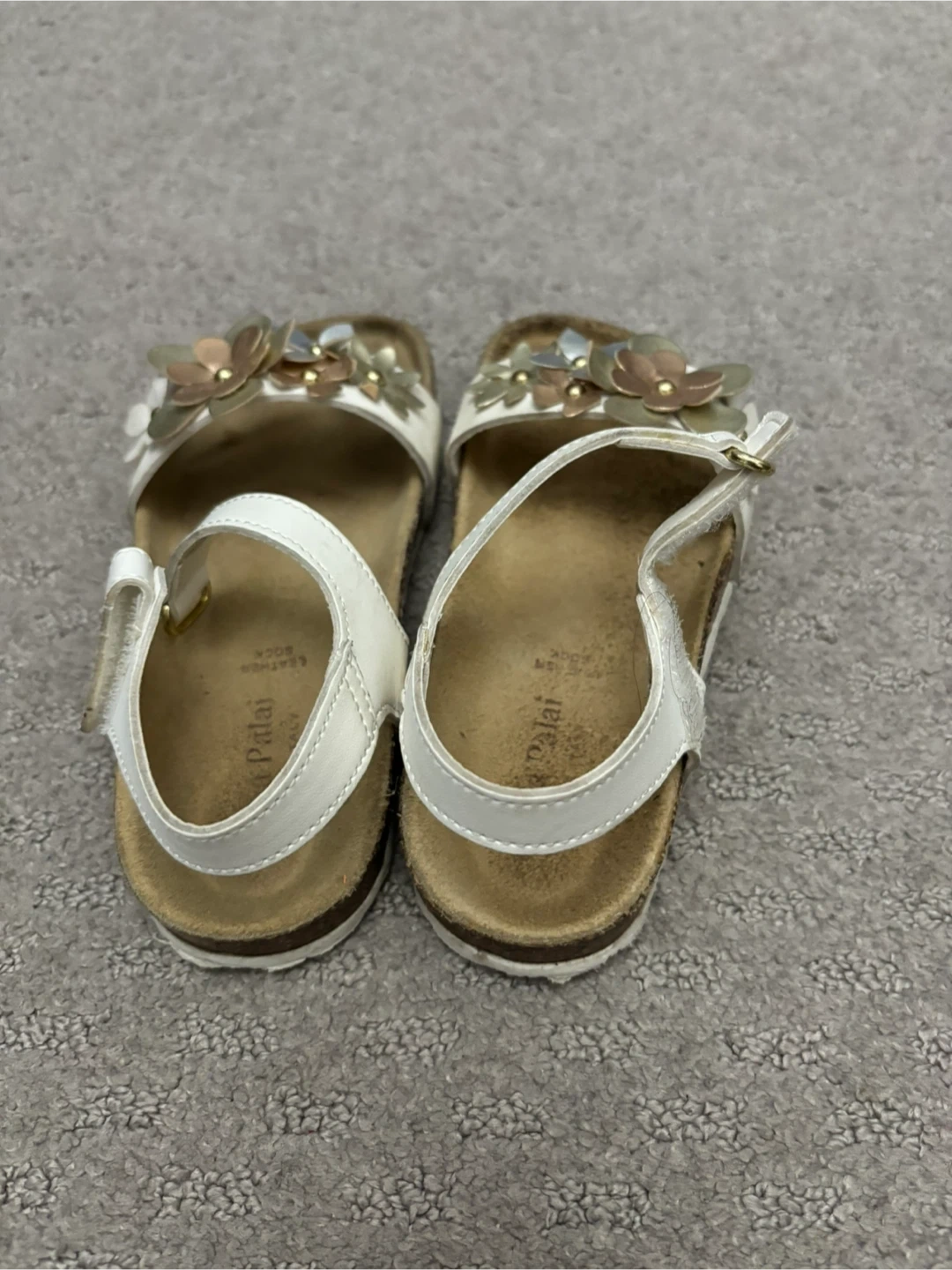 Cute pair of Palai sandals in a size 11! They feature a white leather upper and flower details. Perfect for your little one's summer adventures!