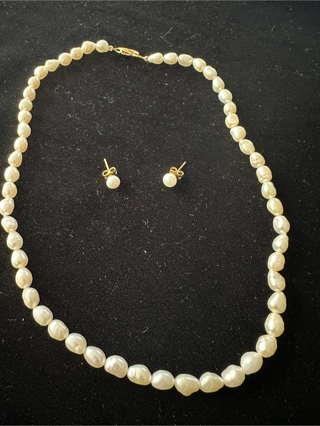 Selling a beautiful pearl necklace and earring set. The necklace features a gold-tone clasp, and the earrings are simple pearl studs. Perfect for adding a touch of elegance to any outfit!