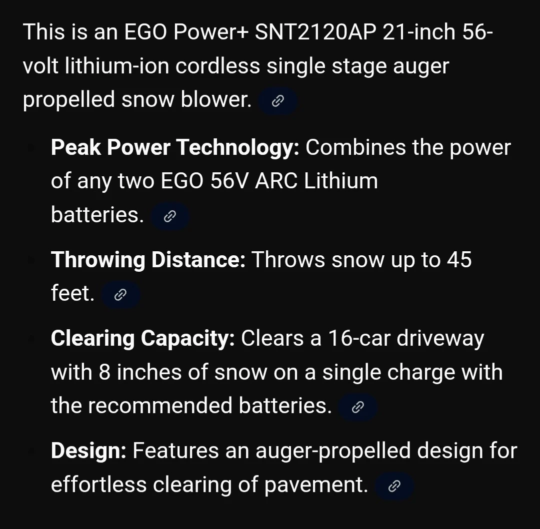 Selling an EGO Power+ SNT2120AP 21-inch 56-volt lithium-ion cordless single stage auger propelled snow blower. It combines the power of any two EGO 56V ARC Lithium batteries. It throws snow up to 45 feet and clears a 16-car driveway with 8 inches of snow on a single charge with the recommended batteries. It features an auger-propelled design for effortless clearing of pavement.