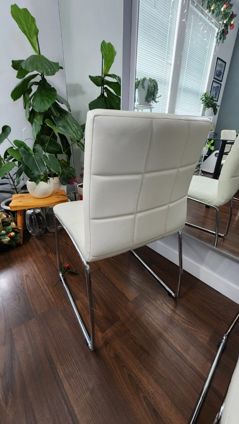 Selling 4 pcs. beautiful white leather dinning chairs, modern design with a quilted pattern on the backrest and a sleek chrome frame.