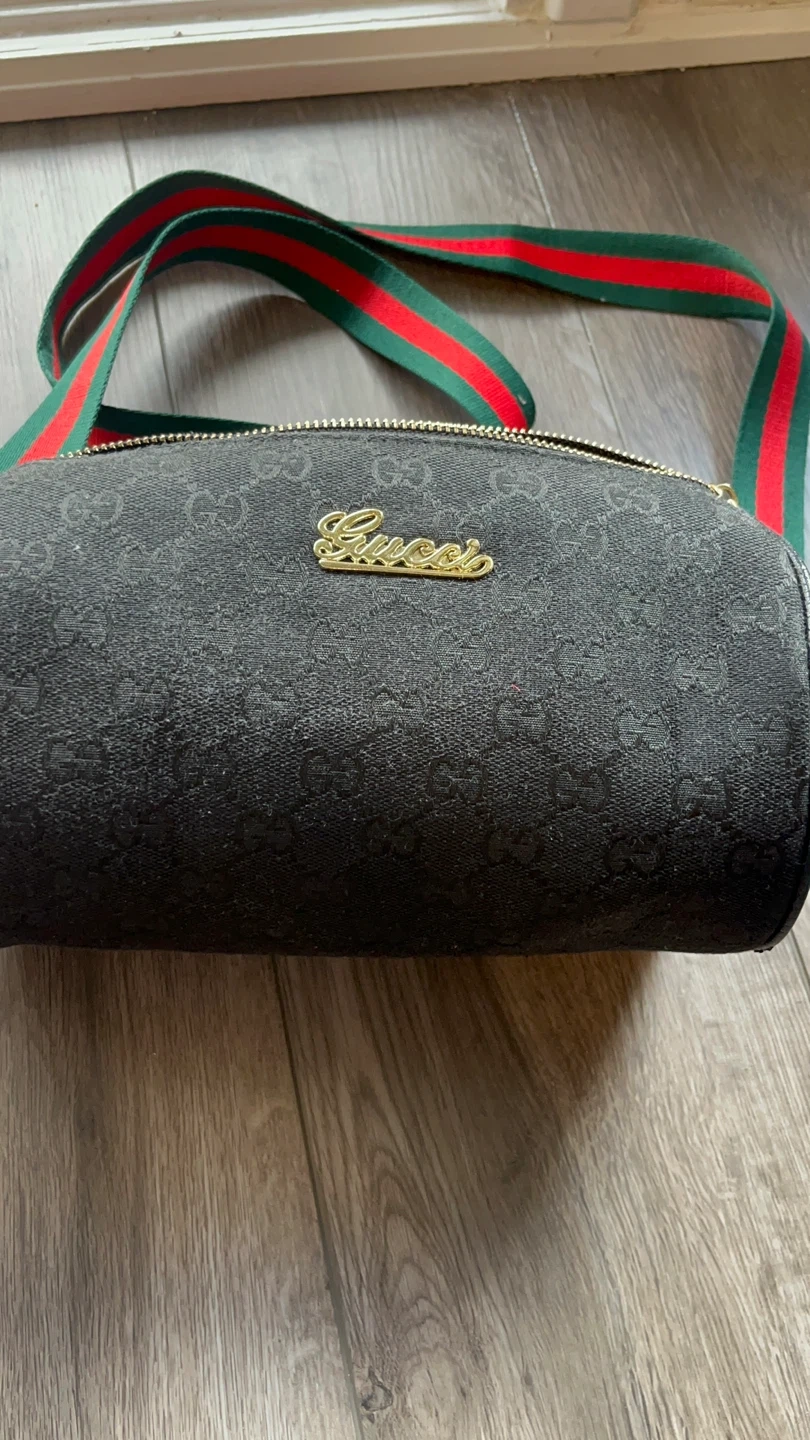 Selling a cute Gucci barrel bag in black canvas! It features the classic Gucci logo pattern and a red and green striped strap. It's in great condition and perfect for everyday use