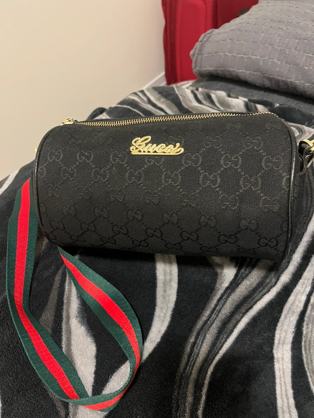 Selling a cute Gucci barrel bag in black canvas! It features the classic Gucci logo pattern and a red and green striped strap. It's in great condition and perfect for everyday use