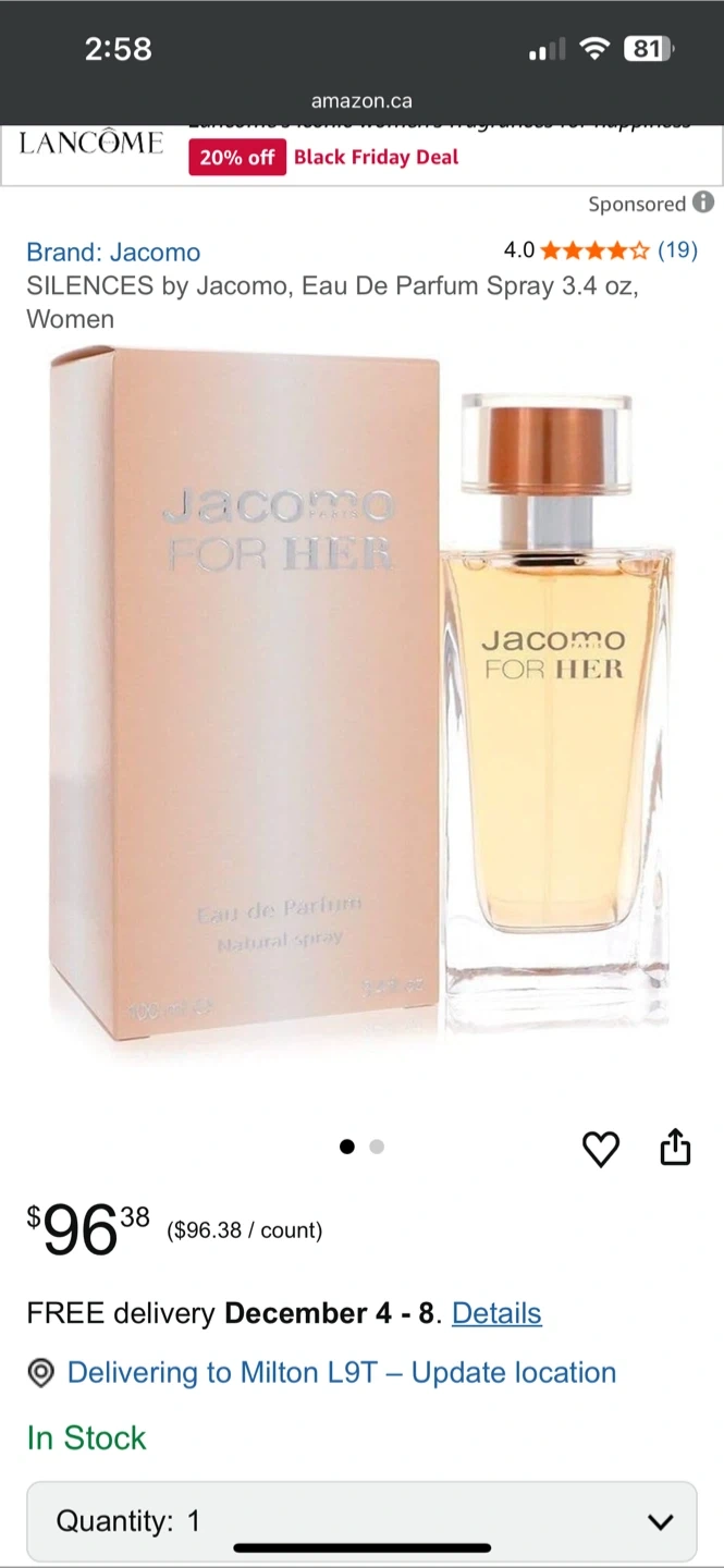 Buy & SellJacomo Silences Eau De Parfum 3.4 ozJacomo Silences Eau De Parfum 3.4 oz$20Selling a bottle of Jacomo Silences Eau De Parfum. This is a 3.4 oz (100 ml) bottle. It's a lovely fragrance!BrandJacomoWHERE TO MEETRose way MiltonView MapSELLERHKRose Way120 reviews0 chats·0 favorites·6 viewsSEND CHAT TO SELLERHi HK! I’m interested in your listing.Hi HK! I’m interested in your listing.Get the Karrot app to chatSign In to chat