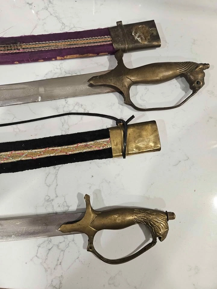 Pair of decorative ceremonial sabres with brass animal-head hilts and etched blades. Includes both matching scabbards with velvet covering. Solid, well-made display pieces with good weight and presence.