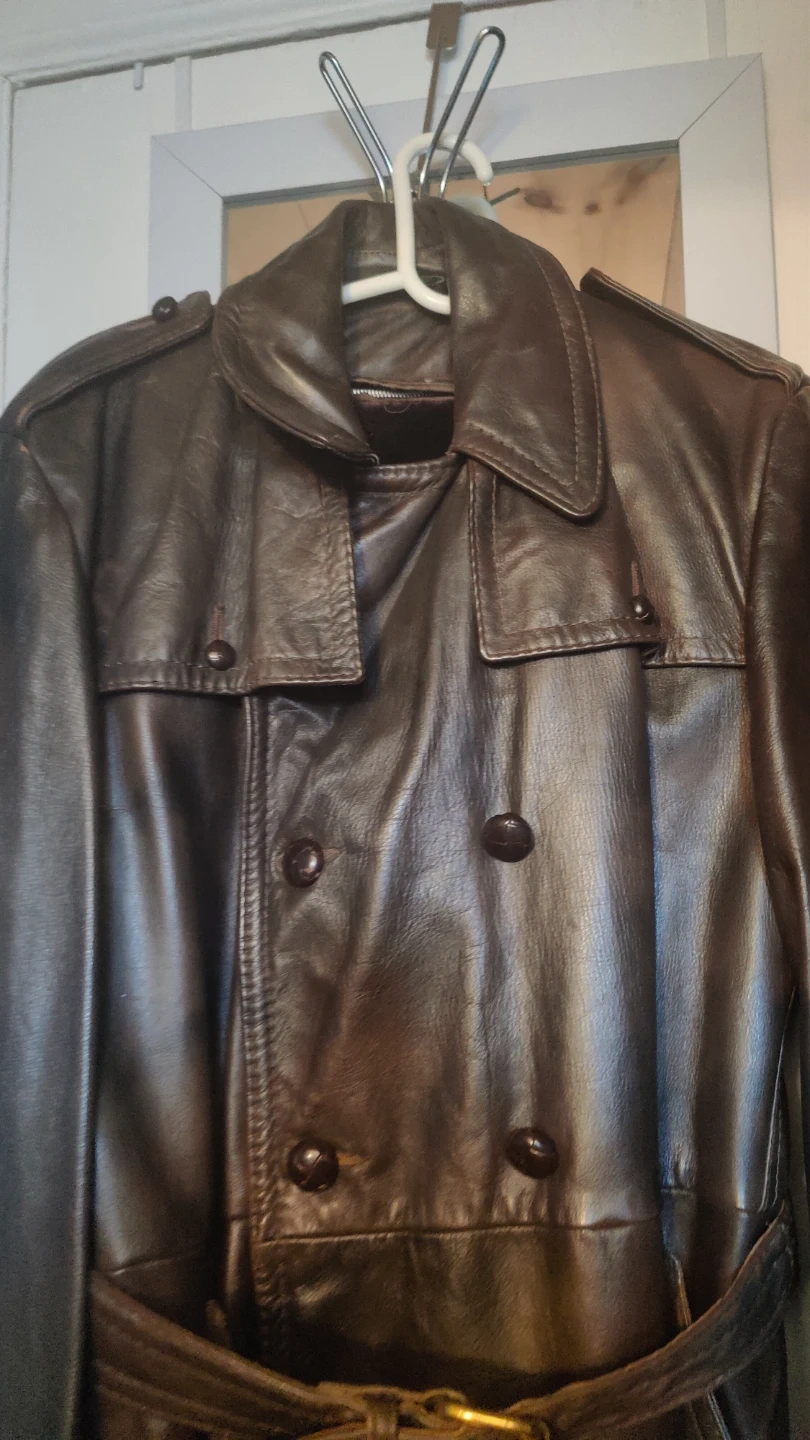 LEATHER, brown, thick Man's Coat in GREAT SHAPE. Size is a large-med. Zip out lining, belt and buttons all in Great shape Issued by military in Alaska early 60s. Very warm. Make offer and will trade for something. I just want this vintage coat be worn by. someone who could use it and enjoy how WARM IT KEEPS THE WEARER. Great to wear when riding a motorcycle/scooter. If interested contact .
