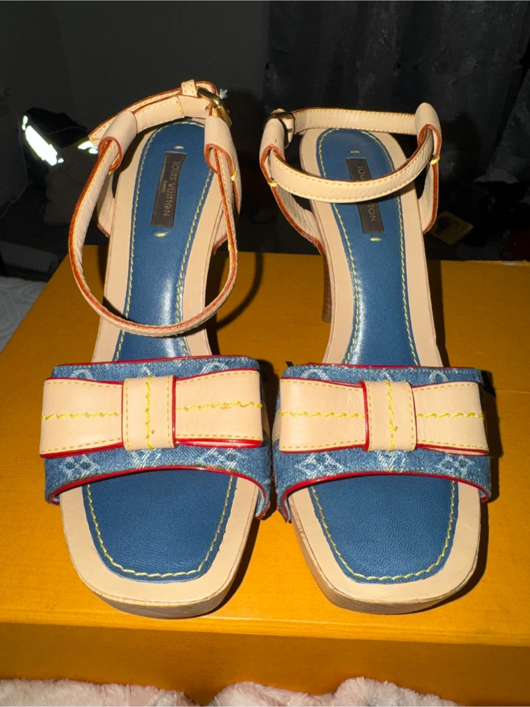 Selling a pair of Louis Vuitton platform sandals! They feature a denim and leather design with a wooden heel. Size 37 (European sizing). Comes with the original box and bag!