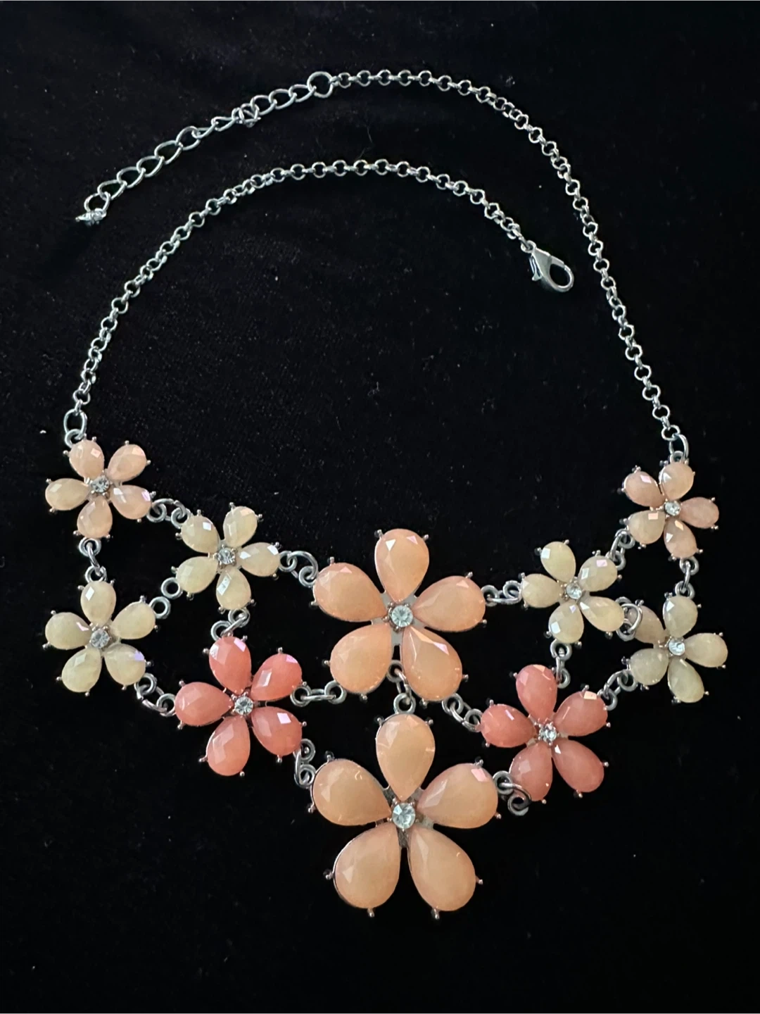 This is a lovely silver-tone chain necklace featuring peach and cream coloured flowers with clear rhinestones at the centre of each flower. It's in great condition and would be a beautiful addition to any outfit