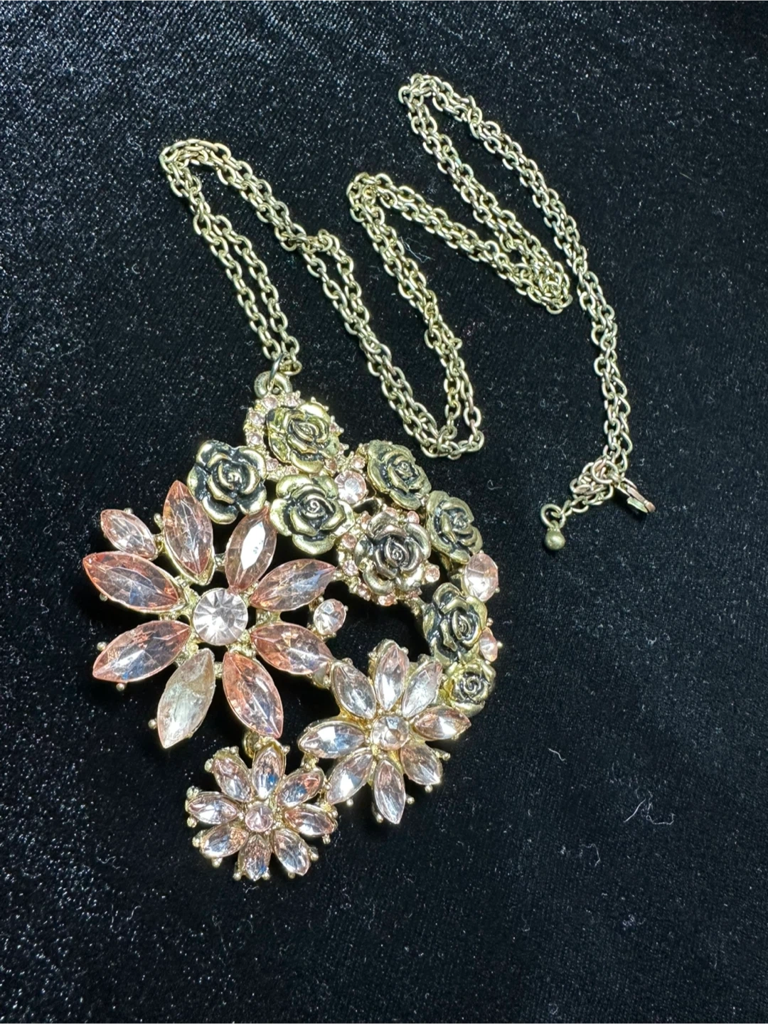 This is a beautiful gold necklace with a floral design. It features a mix of rose and petal shapes, adorned with sparkling stones. It's perfect for adding a touch of elegance to any outfit!