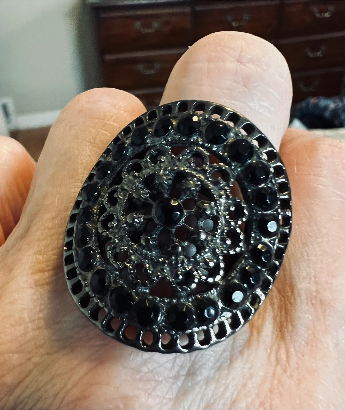 Selling a beautiful black statement ring! It features an intricate design with black stones. The ring is adjustable, making it a comfortable fit for most finger sizes.
