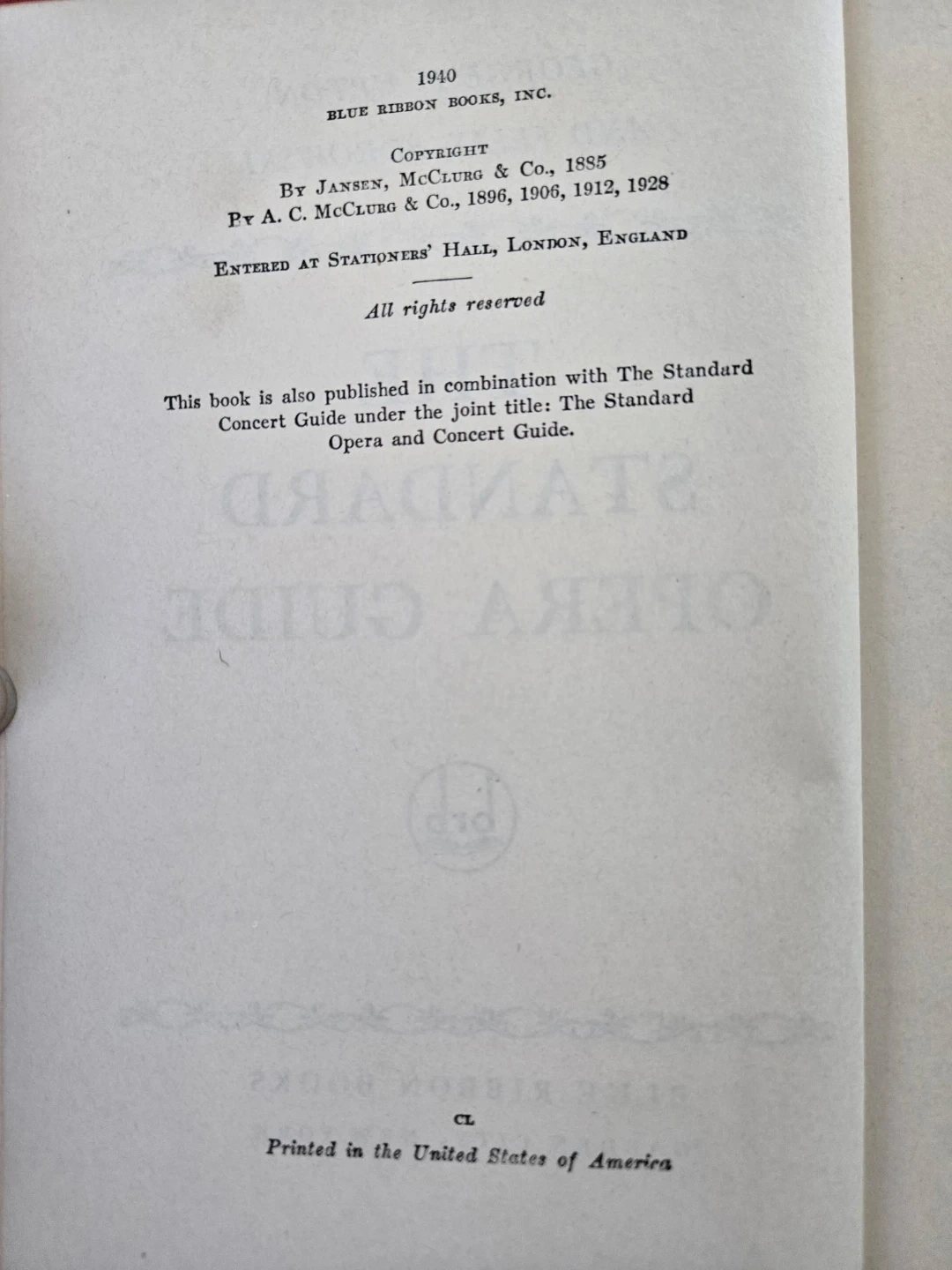 Selling a vintage copy of "The Standard Opera Guide" by George P. Upton and Felix Borowski. This book is published in combination with The Standard Concert Guide under the joint title: The Standard Opera and Concert Guide. Published by Blue Ribbon Books.
