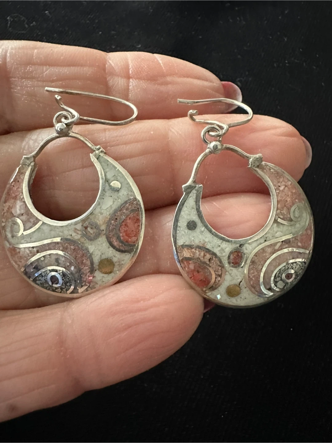 These are a pair of silver hoop earrings with a unique stone inlay design. The earrings feature a mix of colours, including red, white, and silver. They're in great condition and ready to accessorize your outfits!
