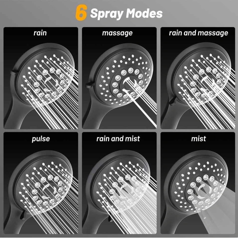 6 spray modes including rain, mist/atomized, high-pressure, and mixed settings