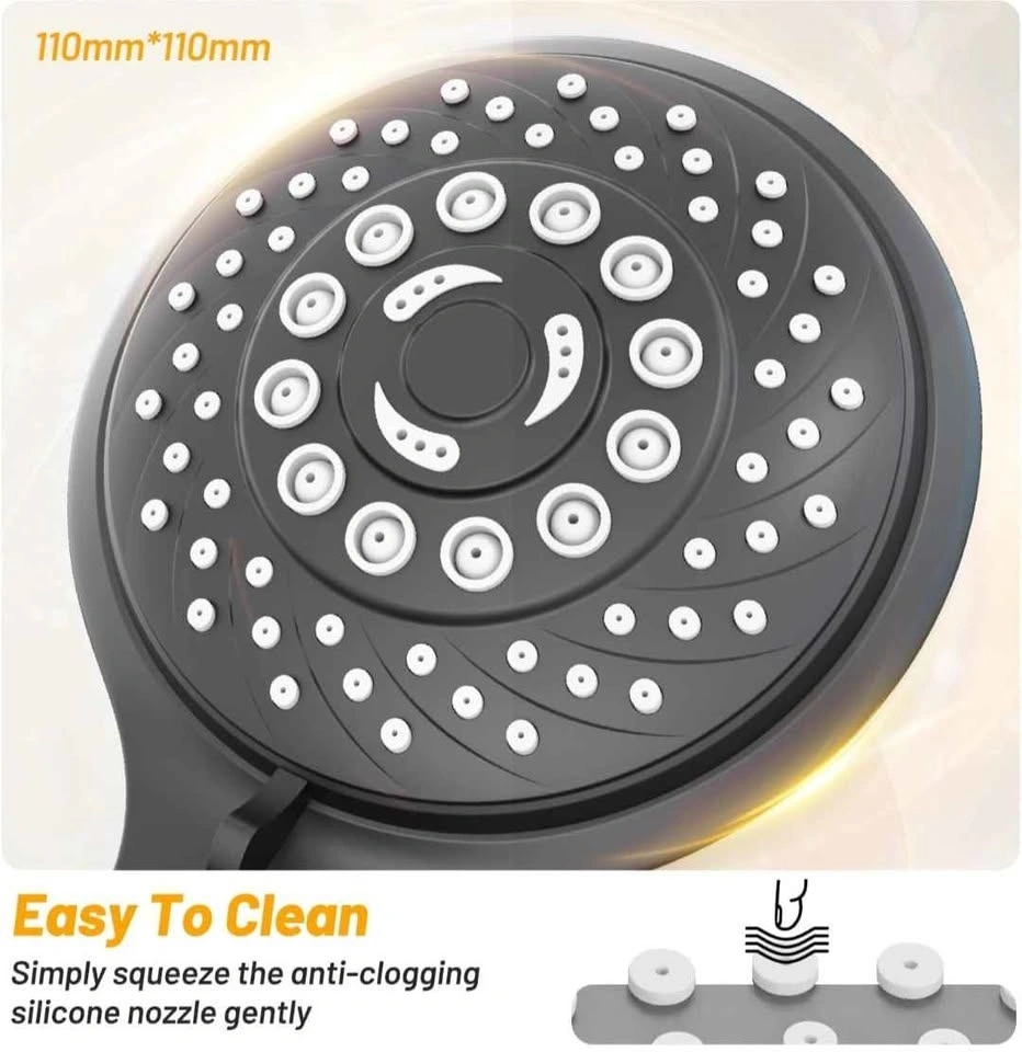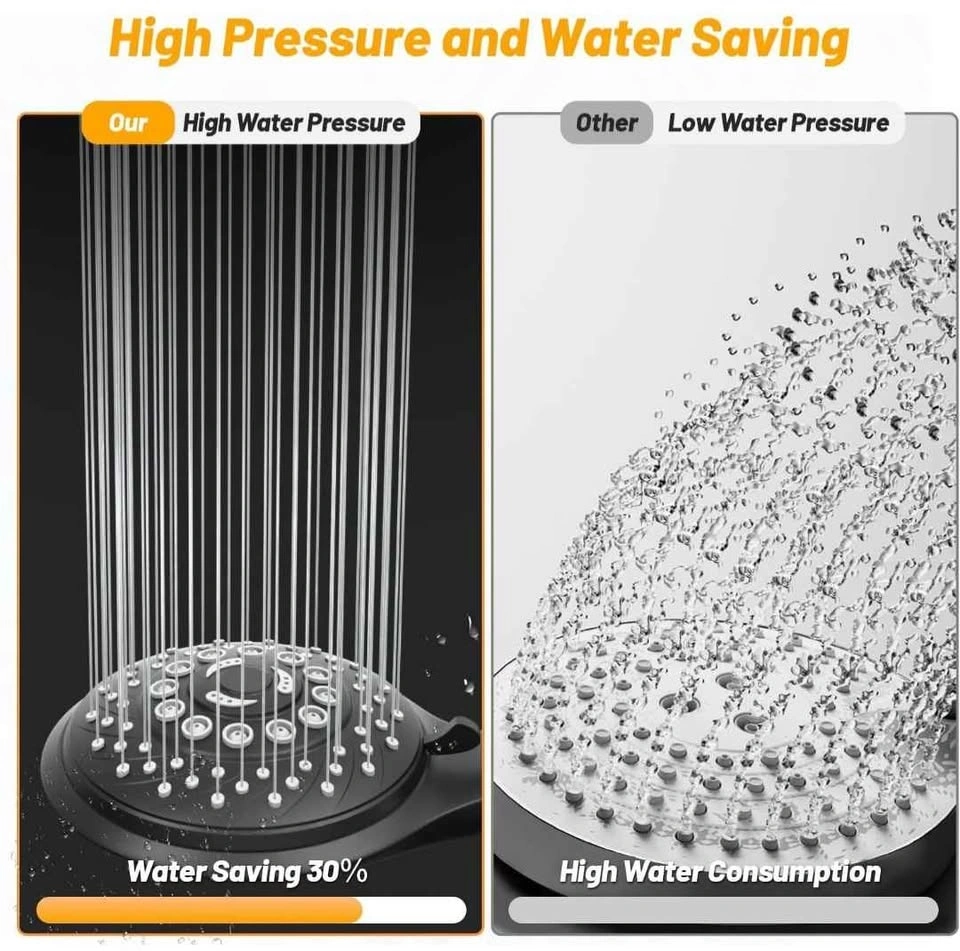 Modern handheld shower head set with multiple spray settings, designed to save water while providing strong and comfortable water pressure. Stylish black finish that suits any bathroom.