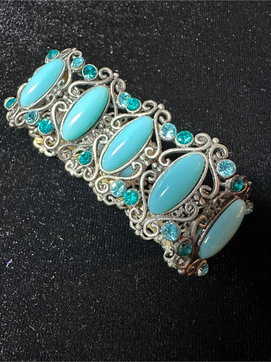Selling a vintage bracelet featuring beautiful turquoise and silver detailing! It's in great condition and would make a lovely addition to any jewelry collection. The bracelet has an intricate design with oval turquoise stones and smaller silver accents. Perfect for adding a touch of vintage charm to your outfit!
