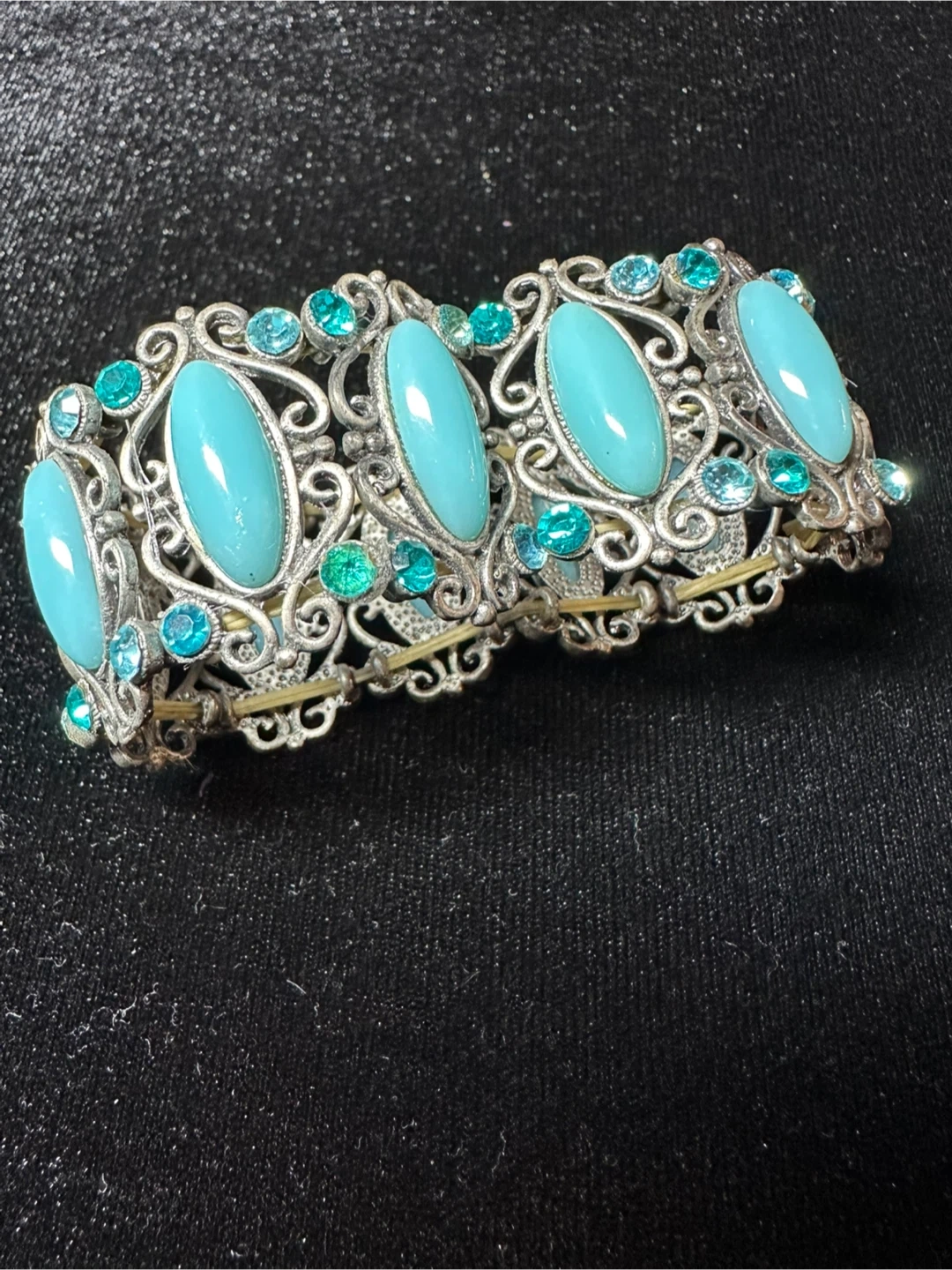 Selling a vintage bracelet featuring beautiful turquoise and silver detailing! It's in great condition and would make a lovely addition to any jewelry collection. The bracelet has an intricate design with oval turquoise stones and smaller silver accents. Perfect for adding a touch of vintage charm to your outfit!