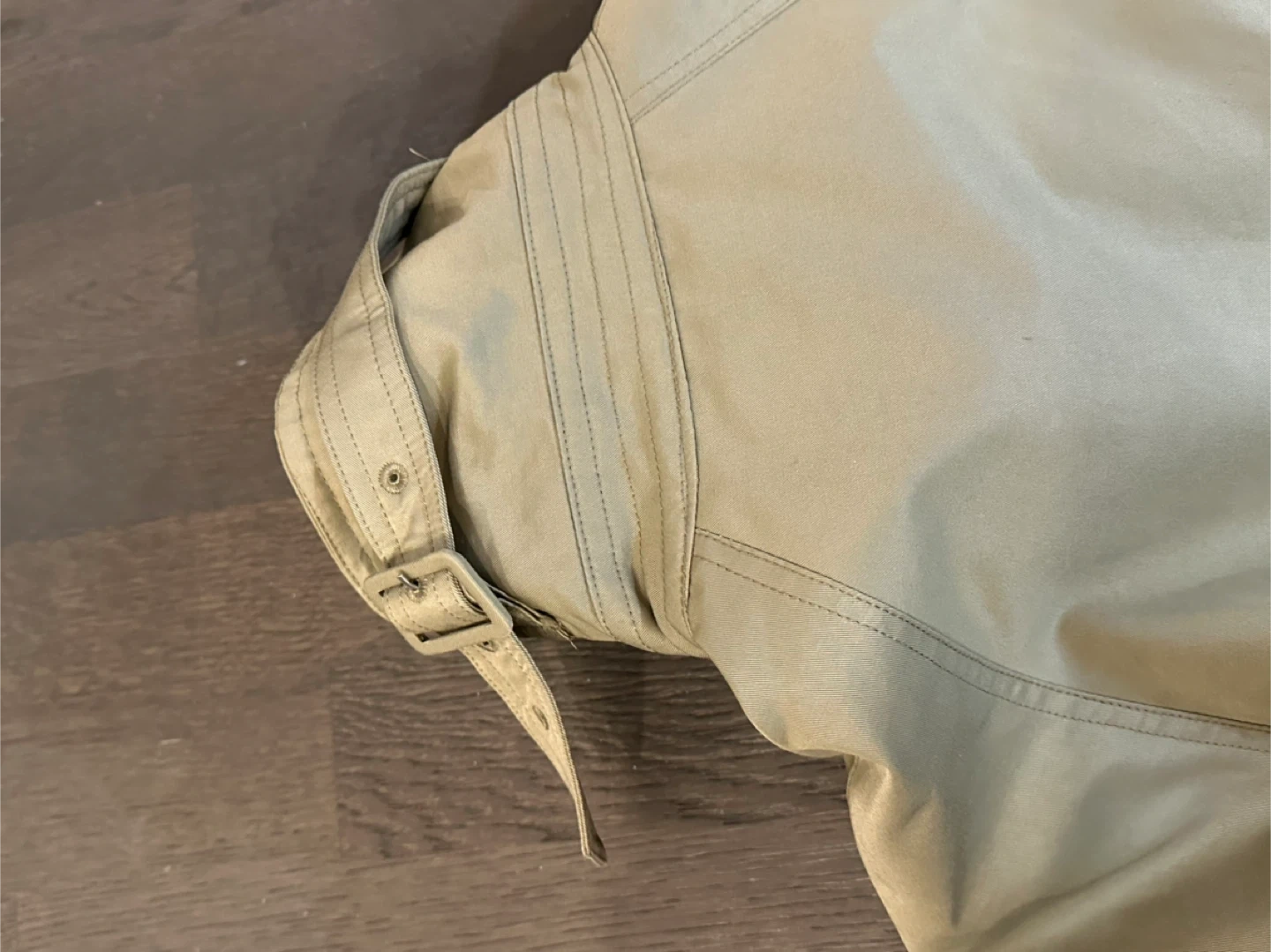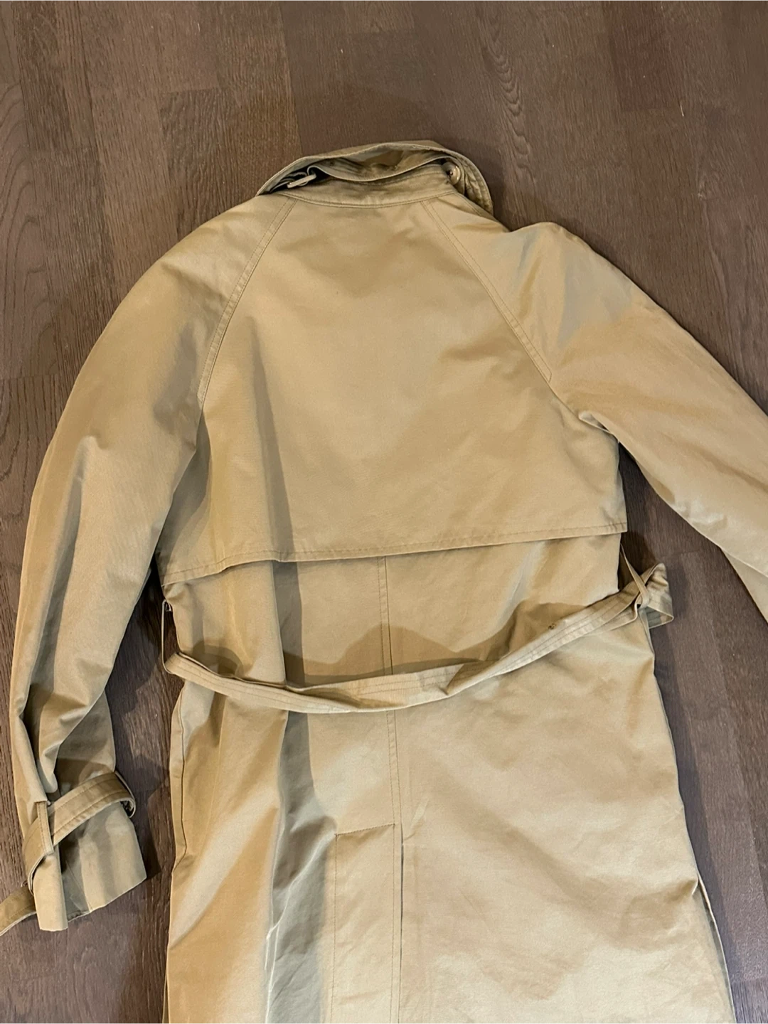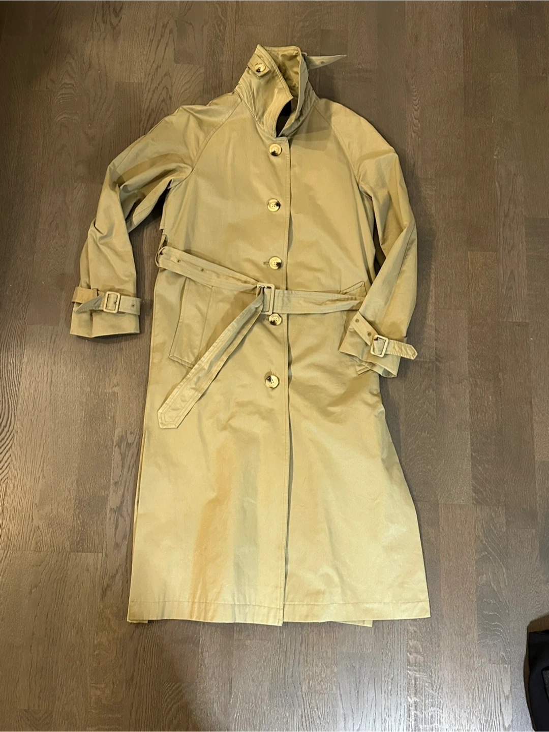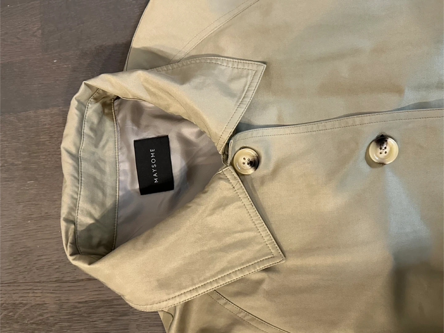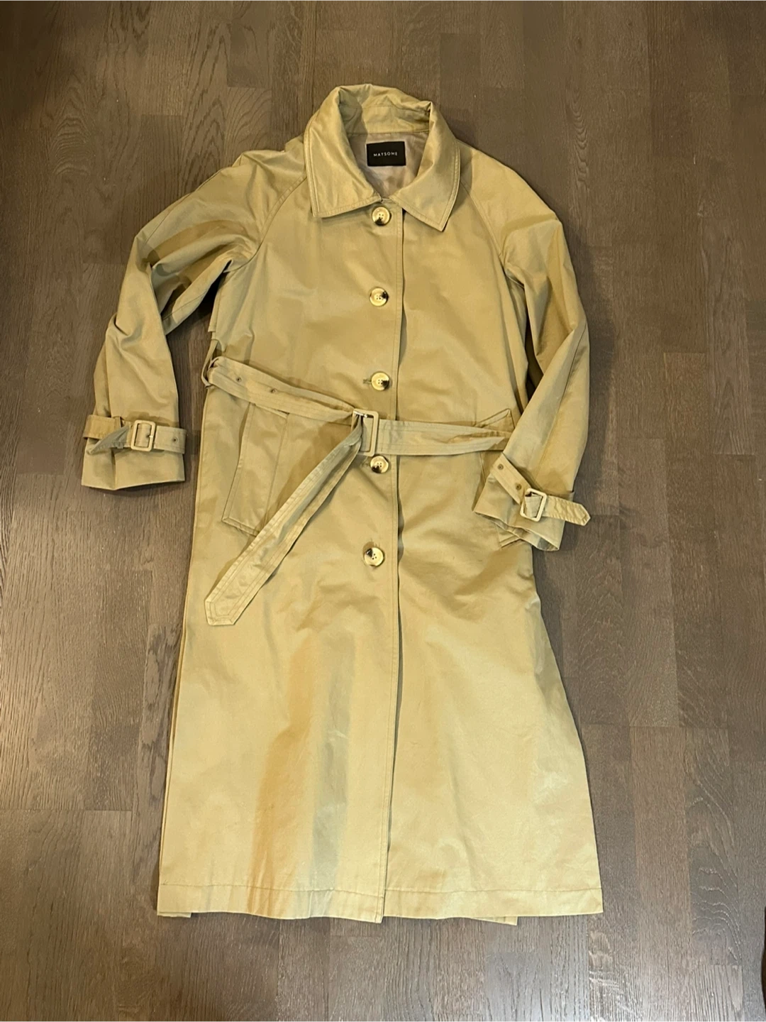 Selling a Maysome trench coat in a classic khaki color. It features a belted waist and buckle details on the sleeves. Perfect for layering!